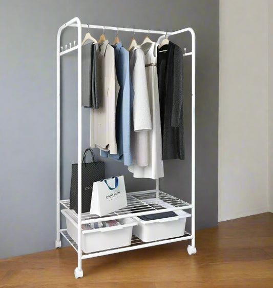 Slim White Metal Clothes Rail Garment Rack with Storage Shelves, Hooks & Rolling Wheels