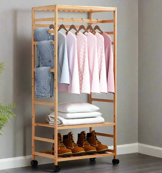 Wooden Clothes Rail Garment Rack with Storage Shelves & Pulley Wheels – Natural Wood Coat & Clothes Hanger Stand