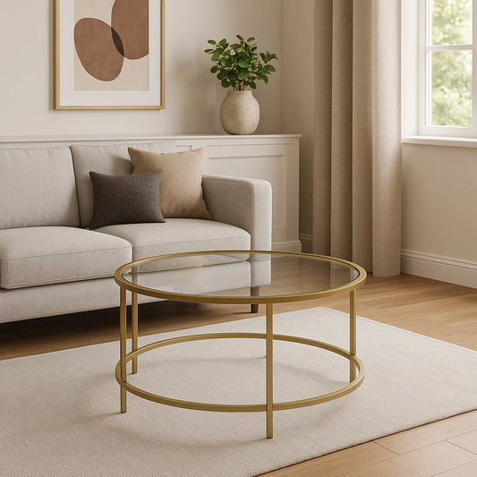 Round Glass Coffee Table with Gold Metal Frame – Modern Living Room Centre Table