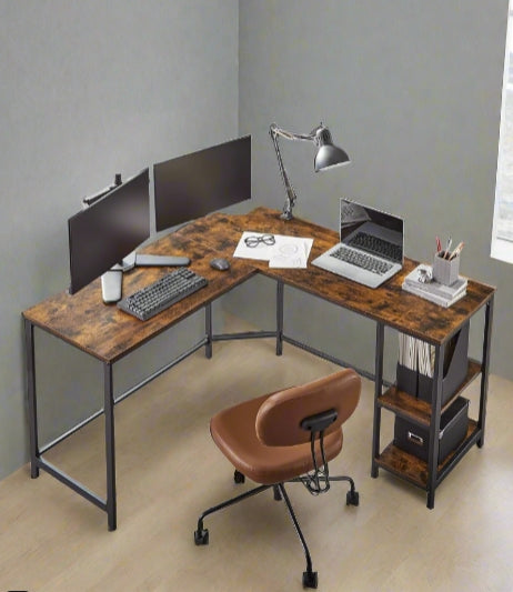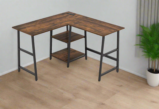 Rustic Brown & Black L-Shaped Computer Desk with Storage Shelves – 138x138 cm