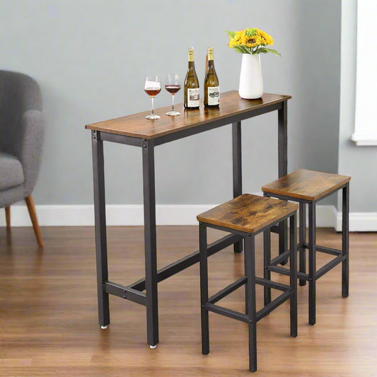 Compact Dining Table and 2 Chairs Set with Footrests, Industrial Style, Rustic Brown and Black