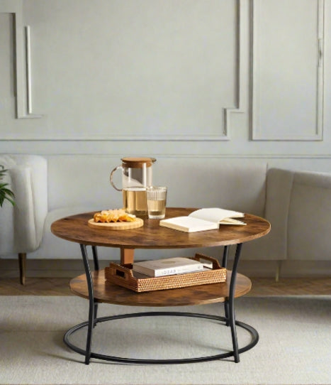 Round Dining Table, Rustic Brown Top with Black Steel Frame, Industrial Style for Kitchen or Office