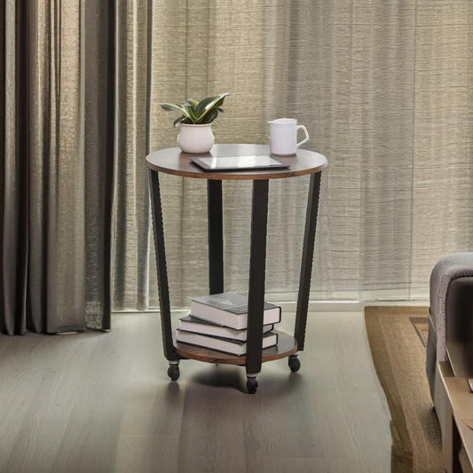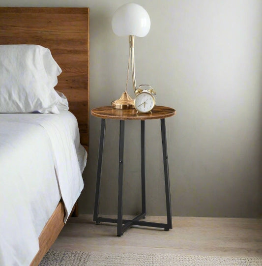 Round Industrial Side Table – Rustic Brown & Black Steel Frame for Living Room & Bedroom