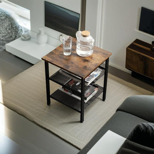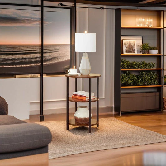 3-Tier Round Sofa Side Table – Rustic Brown & Black Industrial End Table