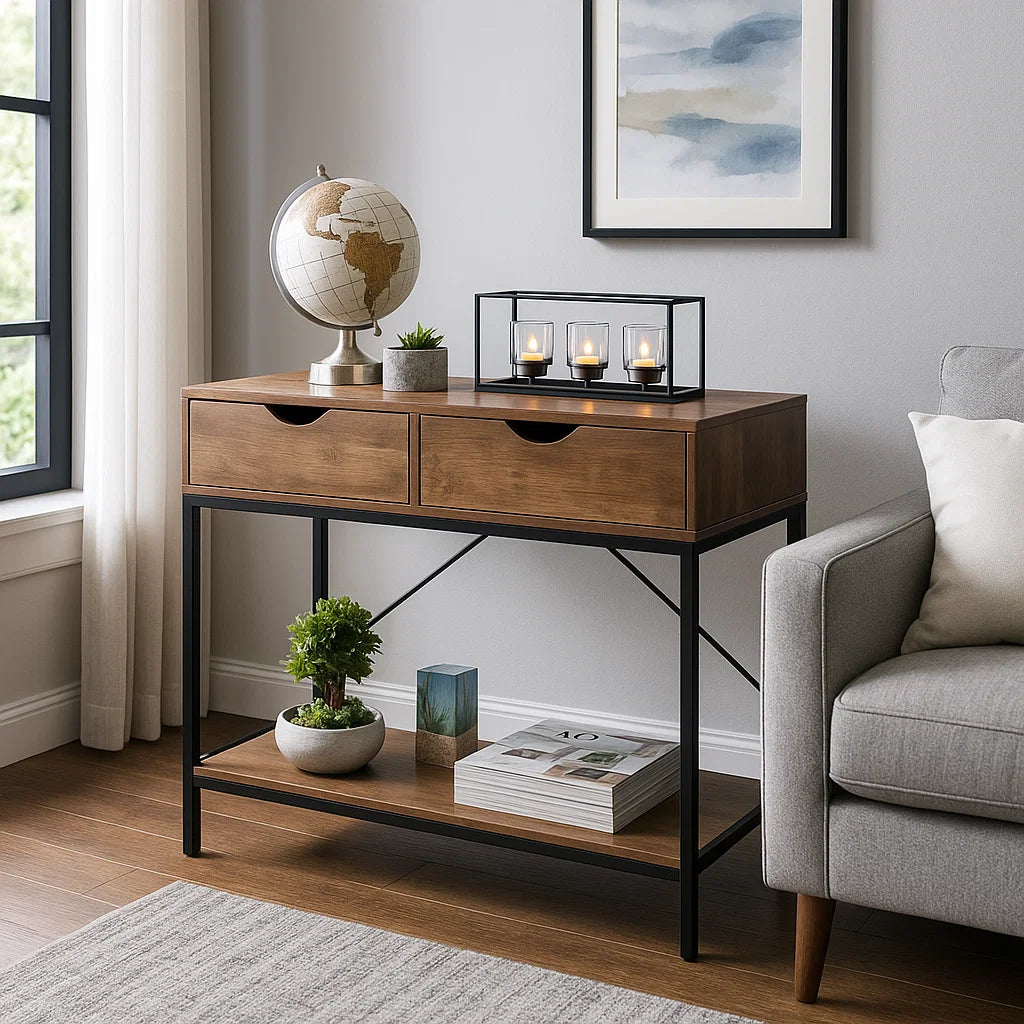 Elevate your entryway or bedroom with this slim console table, designed for a modern yet timeless look. Featuring 2 practical drawers and a lower wooden shelf, this side table offers smart storage for daily essentials, books, and decorative accents.