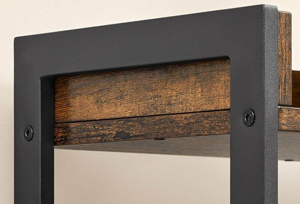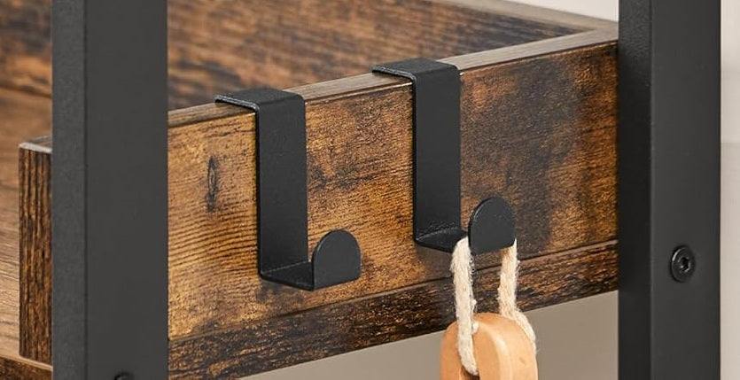 With a clever combination of rustic brown wood grain and sleek black steel, this storage solution adds both charm and practicality to small spaces.