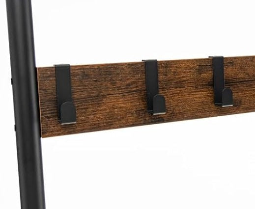 Designed to save space, its wall leaning structure takes up minimal floor area, making it ideal for apartments, dorm rooms, or small living spaces. The sturdy and durable construction, made from heavy-duty metal tubes with a rustproof powder coating, ensures the ladder can hold heavy items without tipping or bending.