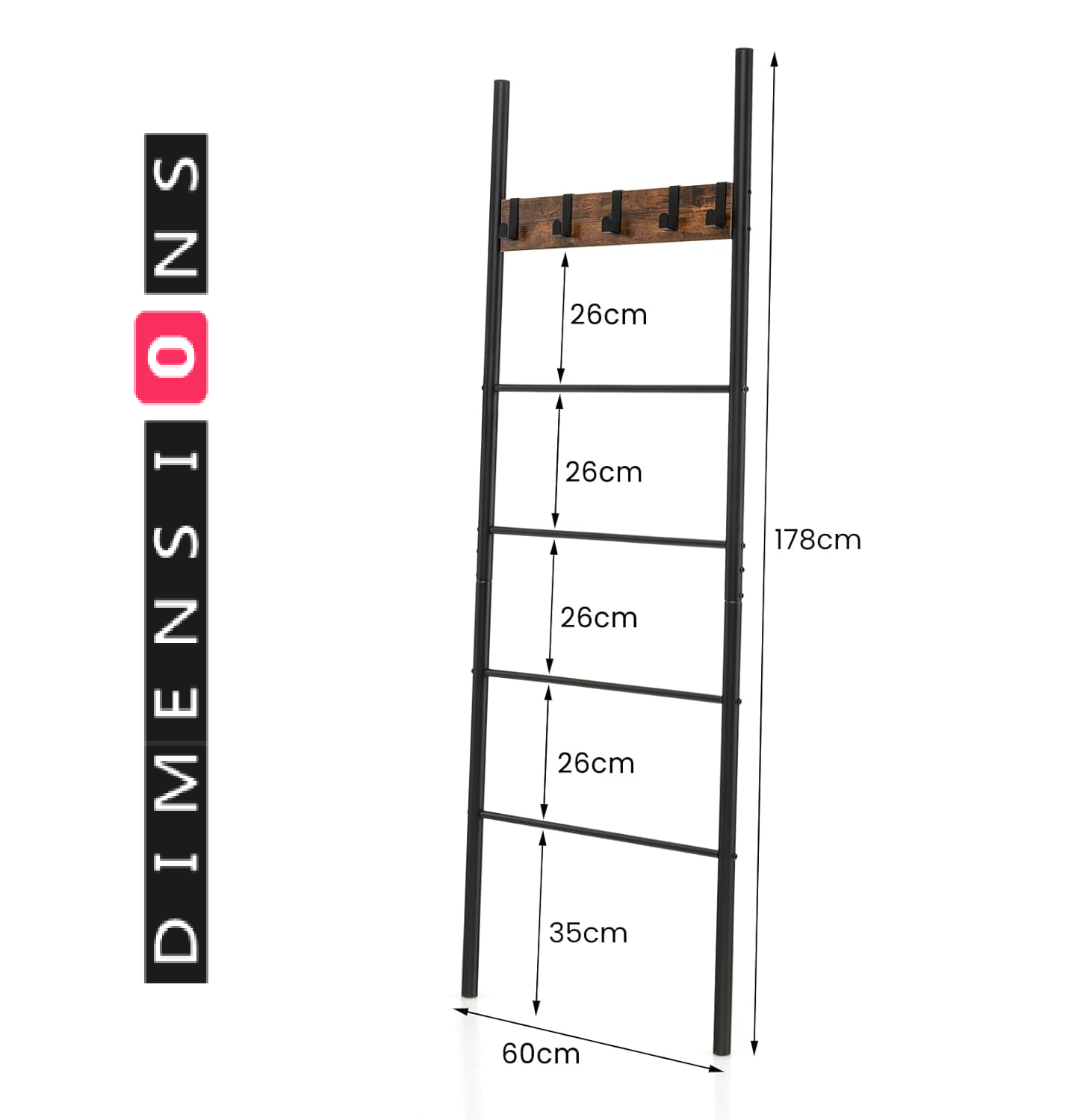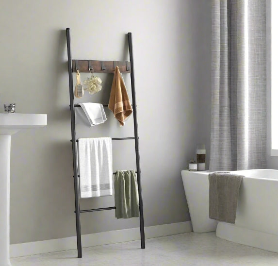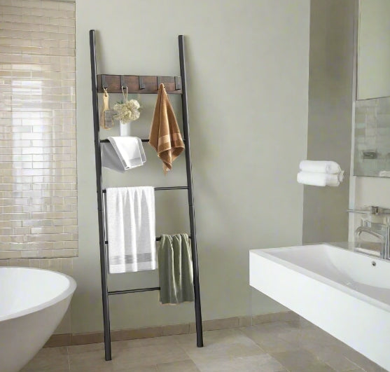 5-Tier Industrial Towel Ladder Shelf with 5 Hooks