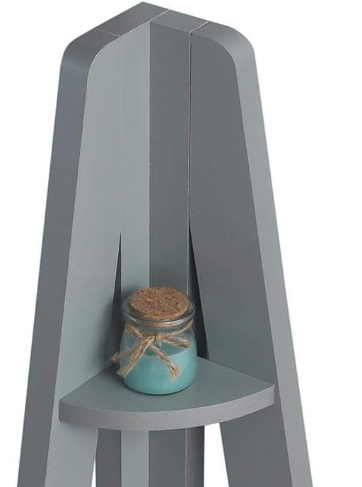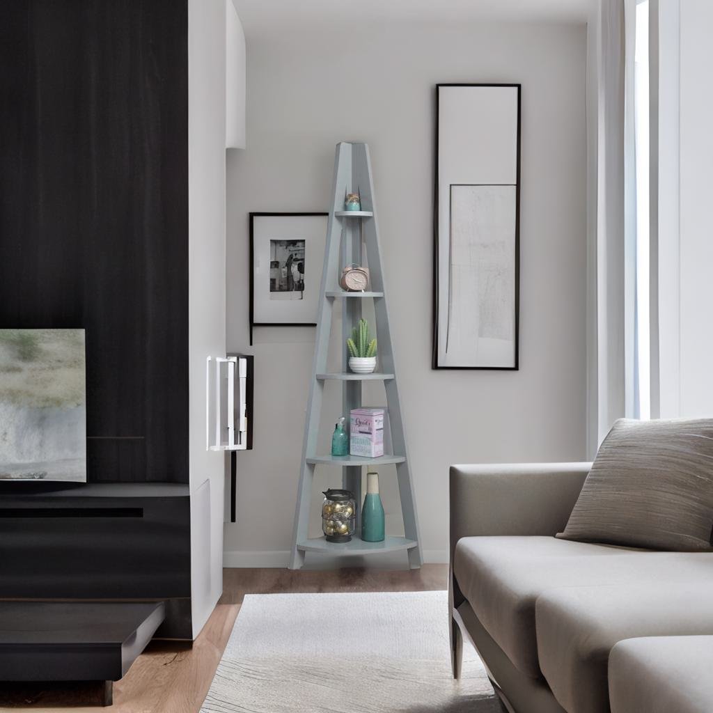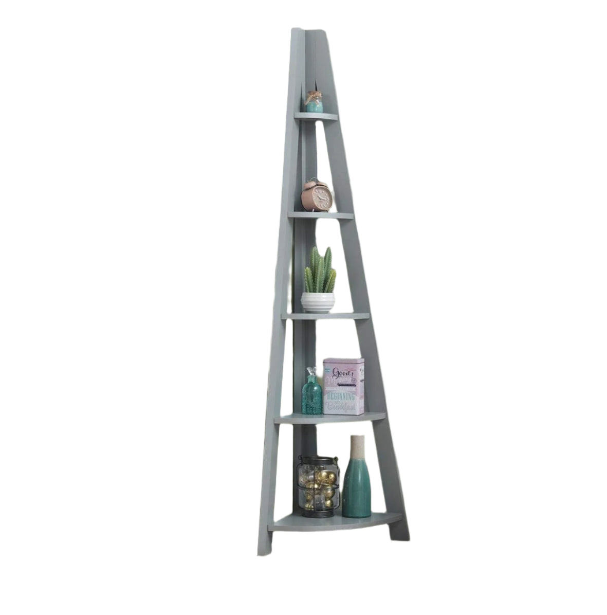 5 Tier Ladder Bookcase – Retro Wooden Corner Shelving Unit | Grey Scandinavian Style