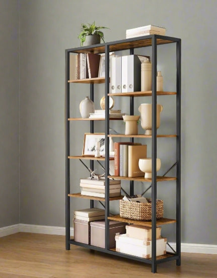 5-Tier Rustic Brown & Black Industrial Bookcase with 10 Compartments