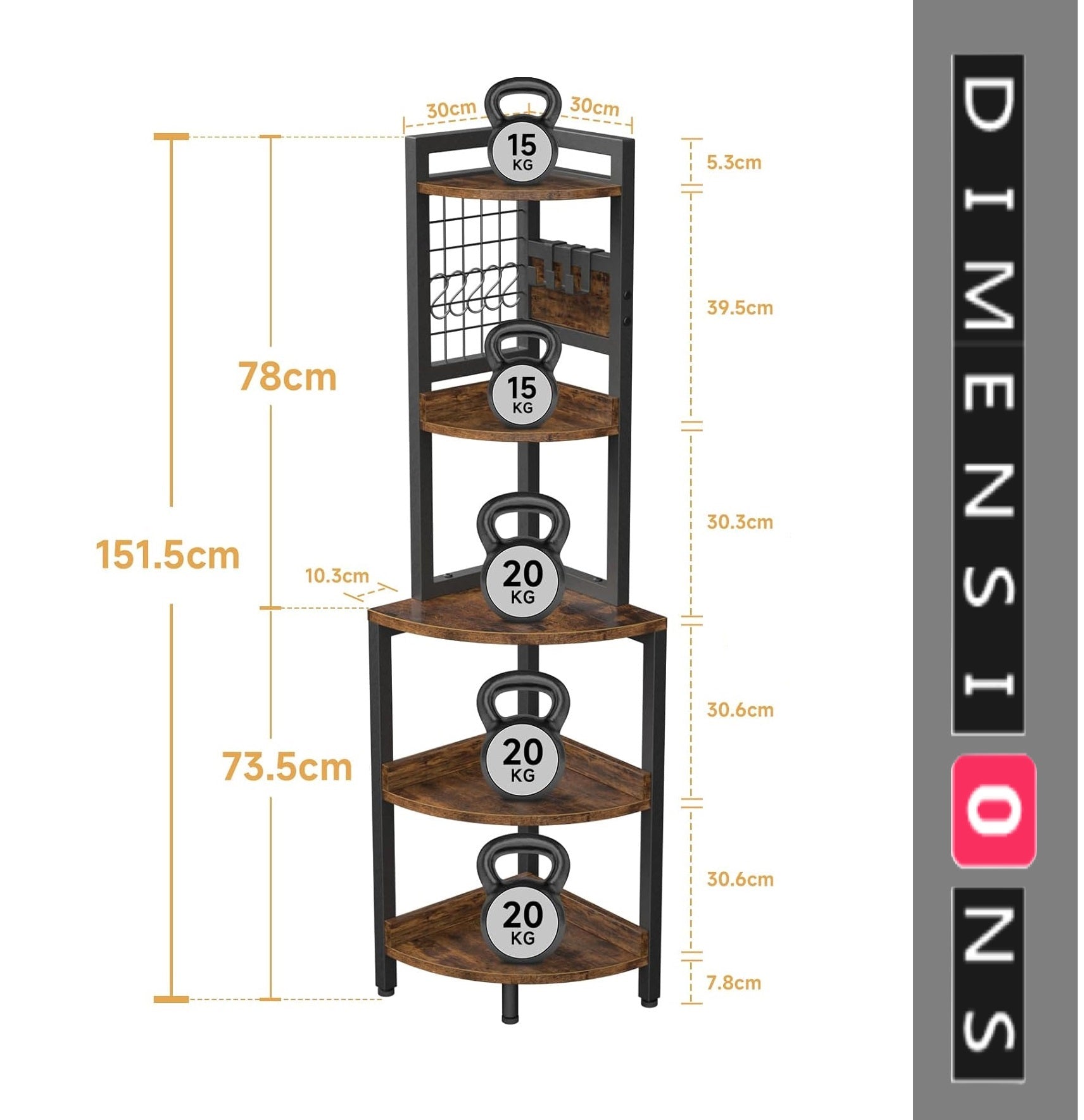 This corner shelf unit, designed with a 90 right angle, optimally utilizes unused corners and fits seamlessly into any room. It's ideal for use as a corner stand, small bookshelf, display shelf, plant stand, or flower rack in compact spaces. The design includes extra support with adjustable feet for stability on uneven ground and anti-toppling fittings to secure it to the wall, ensuring safety. The smooth round edges prevent scratches, and baffles on the sides keep small items from falling. With five tiers, this shelf offers ample storage and includes additional S hooks and metal hooks for keys and small ornaments. Constructed from a heavy-duty metal frame and high-quality particle board, it is built for stability and durability, supporting heavier items like kitchenware or small aquariums. Assembly is required, but the included instructions and marked parts make it easy. If you encounter any issues, support is available.