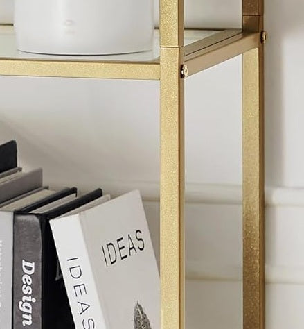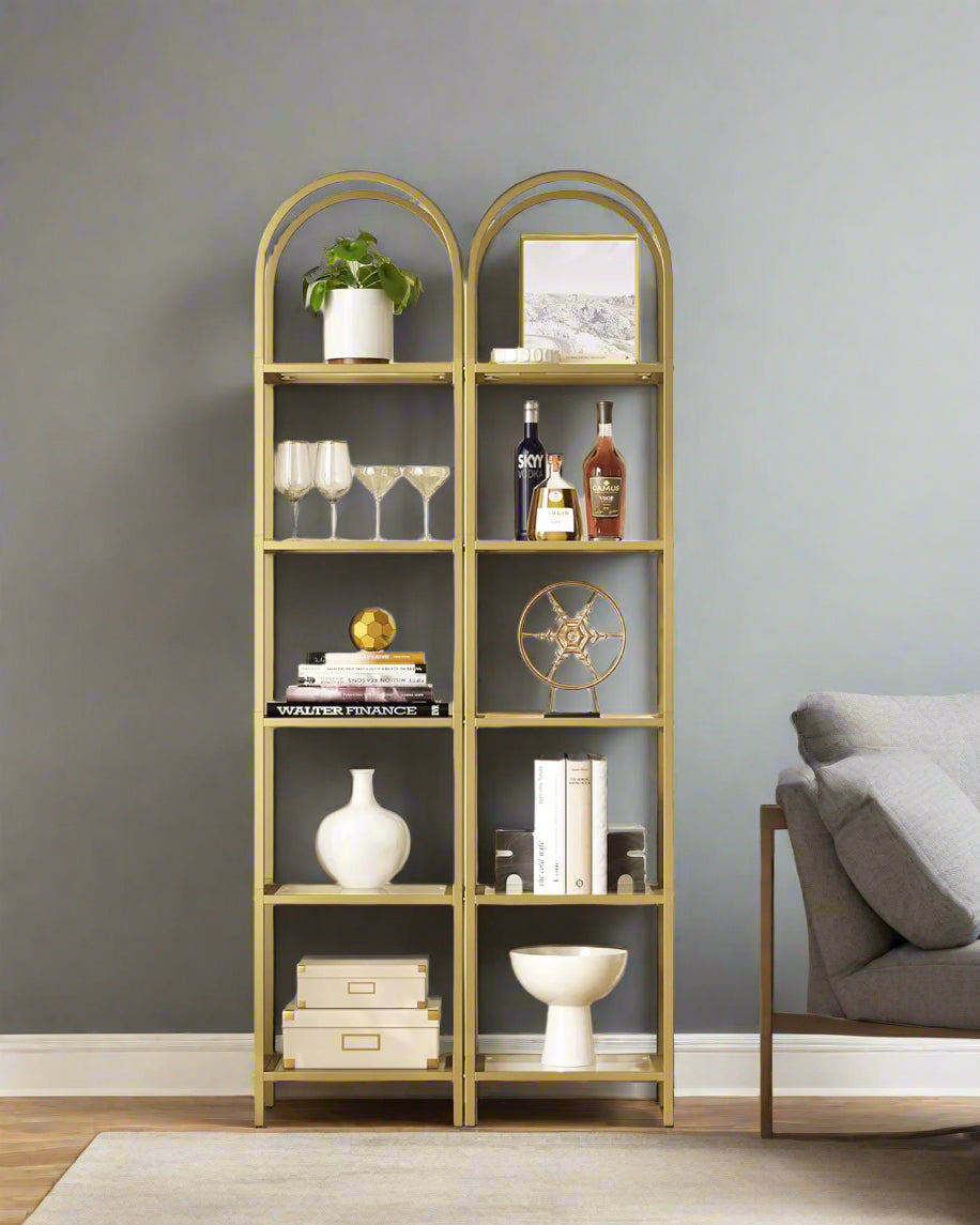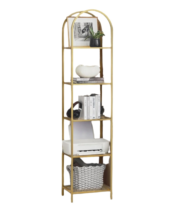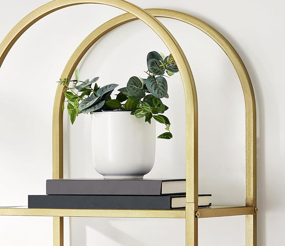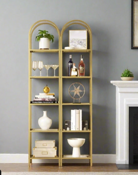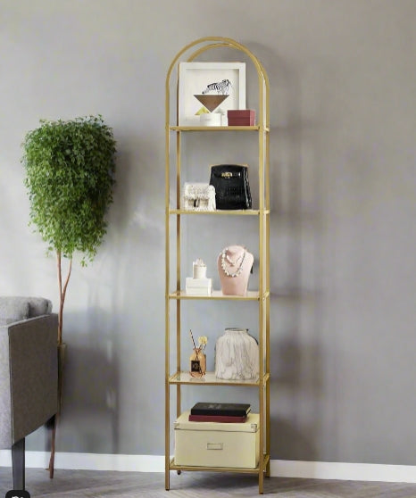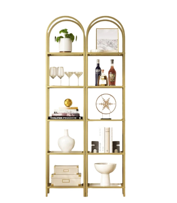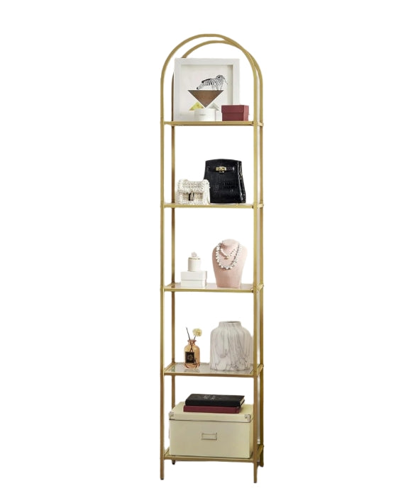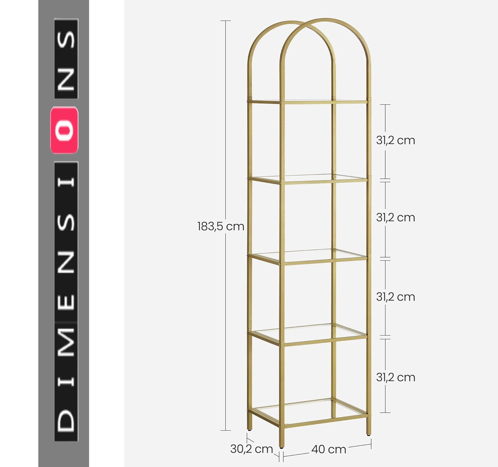 Showcase your favourite decor pieces in style with this elegant 5-tier shelving unit. Featuring a striking arched design, transparent tempered glass shelves, and a metallic gold steel frame, this shelving rack is designed to elevate the look of any room.