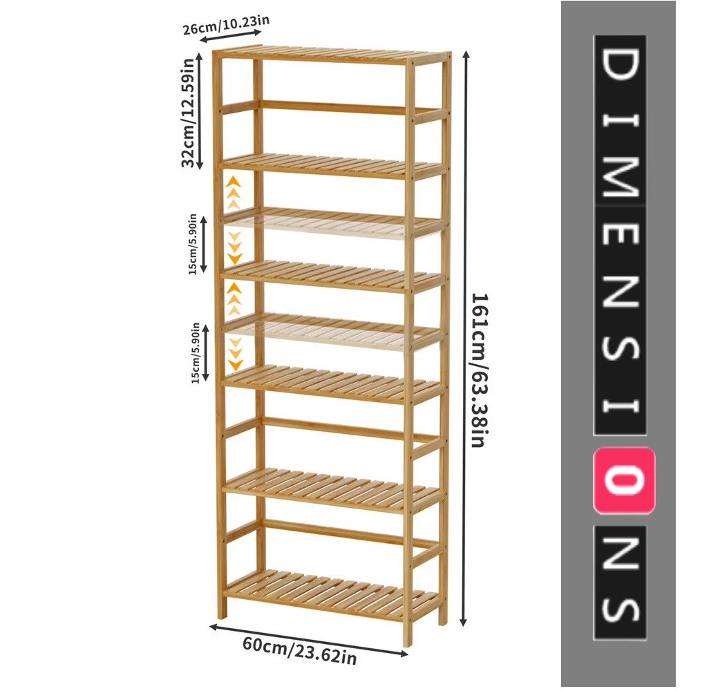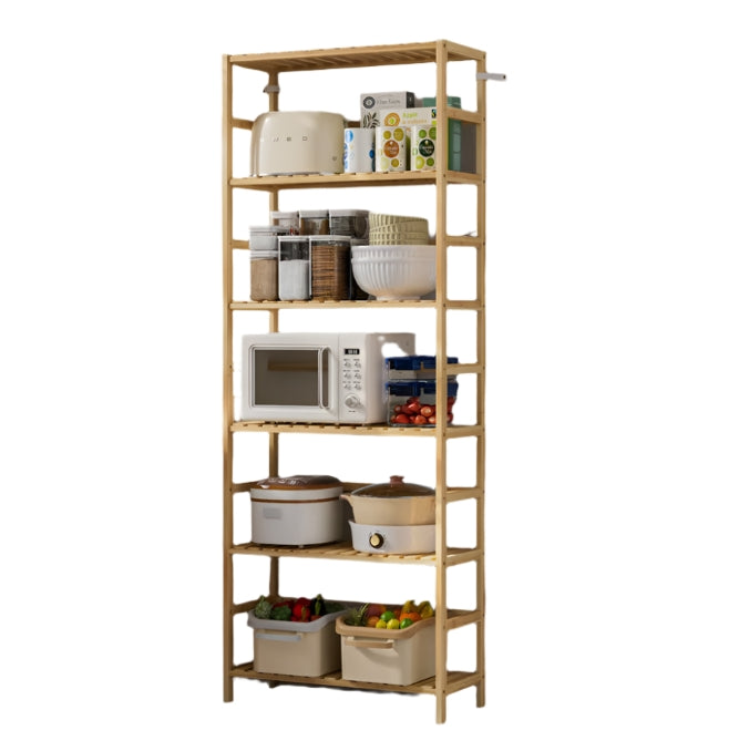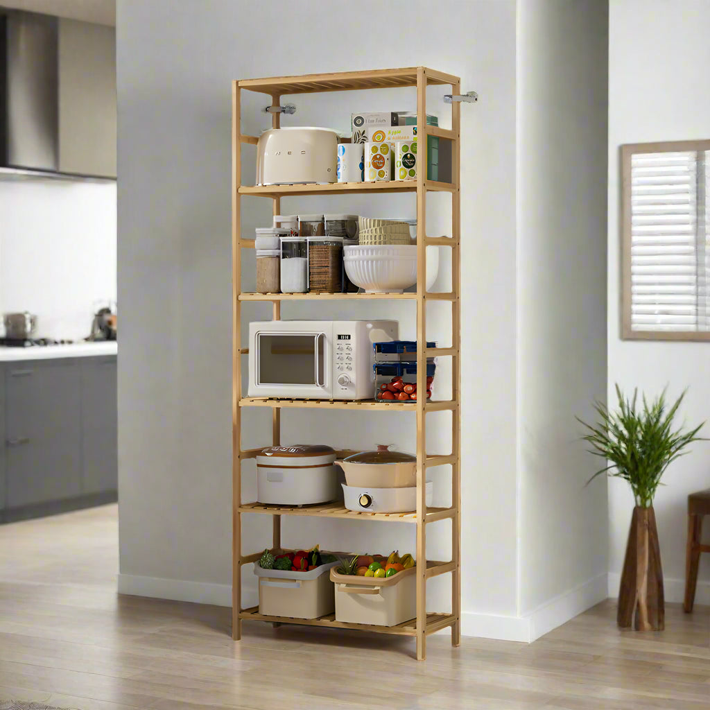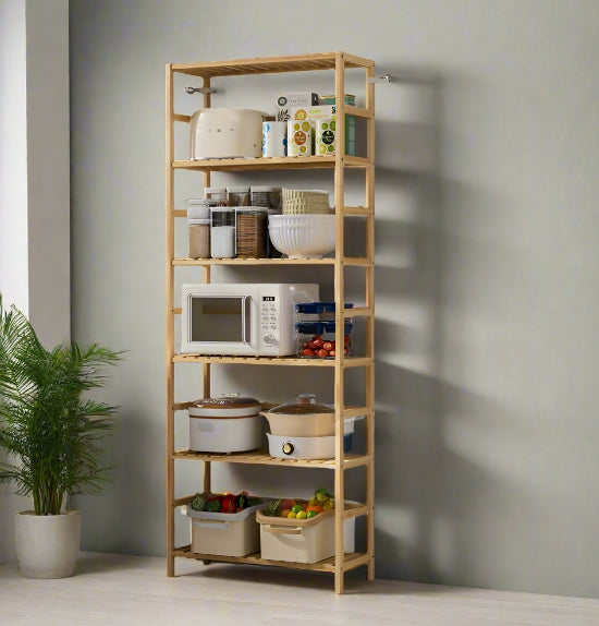 Tidy up your space with this versatile 6-tier bamboo bookshelf. Whether used in the kitchen, bathroom, or living room, its open-shelf design is perfect for displaying décor, storing cookware, or organizing everyday essentials. The adjustable shelves let you tailor the spacing for taller items, while the rear crossbar and included anti-tip kit provide extra safety—ideal for homes with children. Its natural bamboo construction adds warmth, durability, and eco-friendliness to any room.