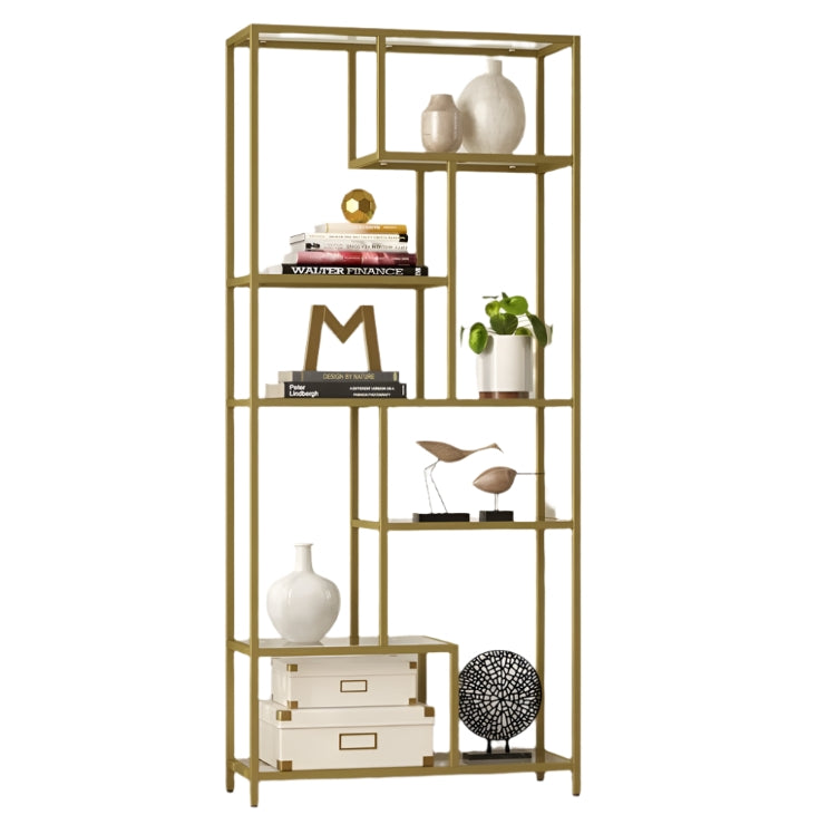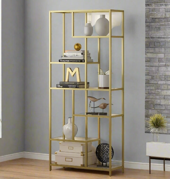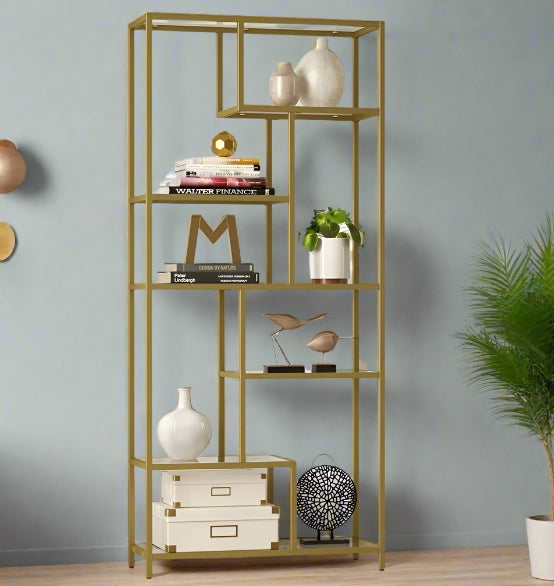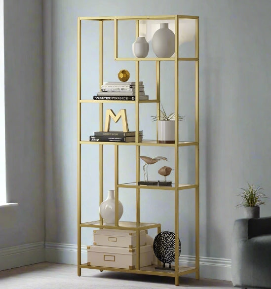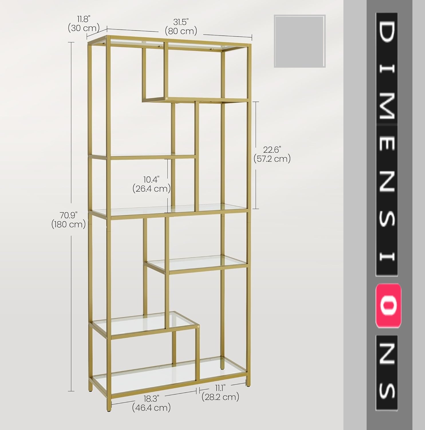 Add a touch of elegance and modern flair to your home with this 6-tier tempered glass bookshelf in striking metallic gold. Measuring 30 x 80 x 180 cm, this tall display shelf features open geometric shelving with varied heights to accommodate books, plants, décor, or kitchen jars with style and ease.