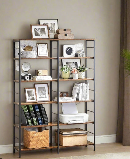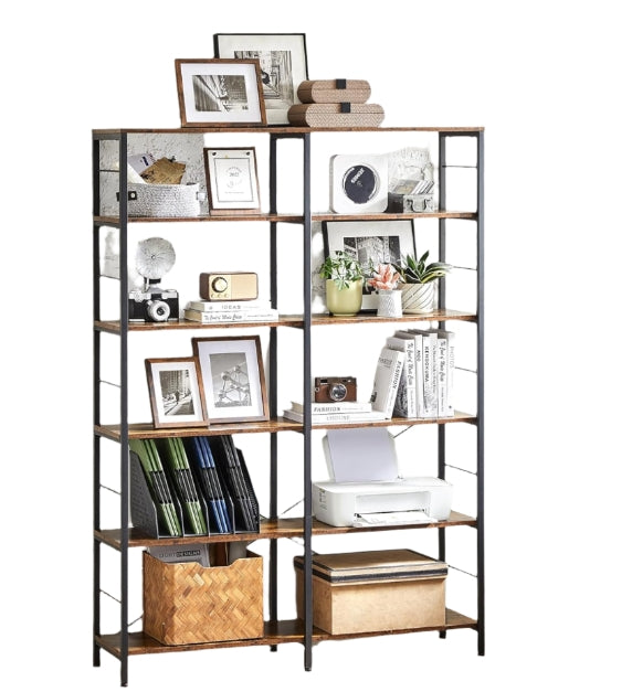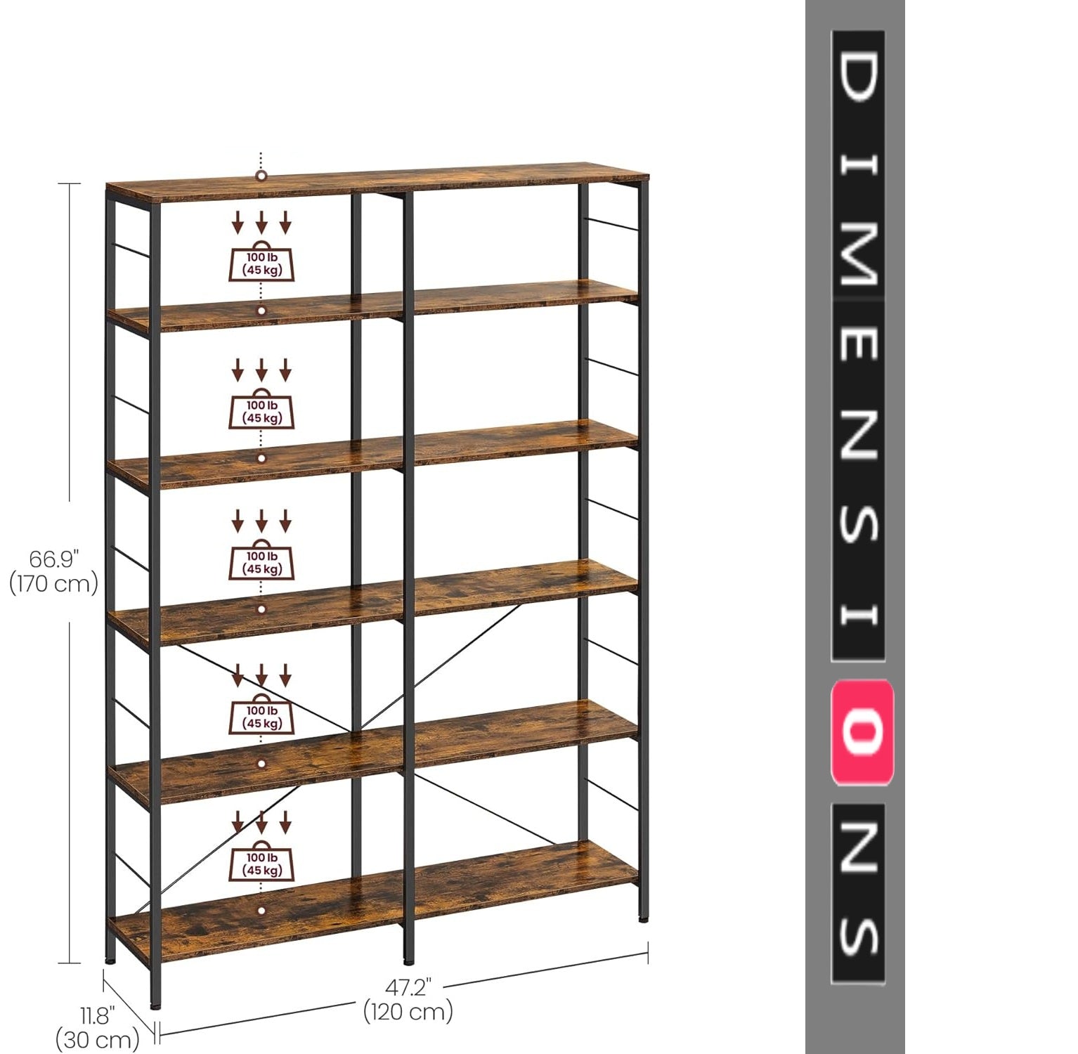 6-Tier Industrial Bookshelf with Steel Frame – Rustic Brown & Ink Black Tall Storage Shelf, 120 cm Wide