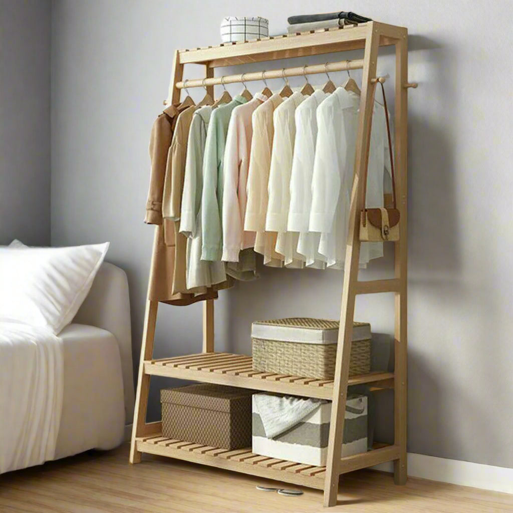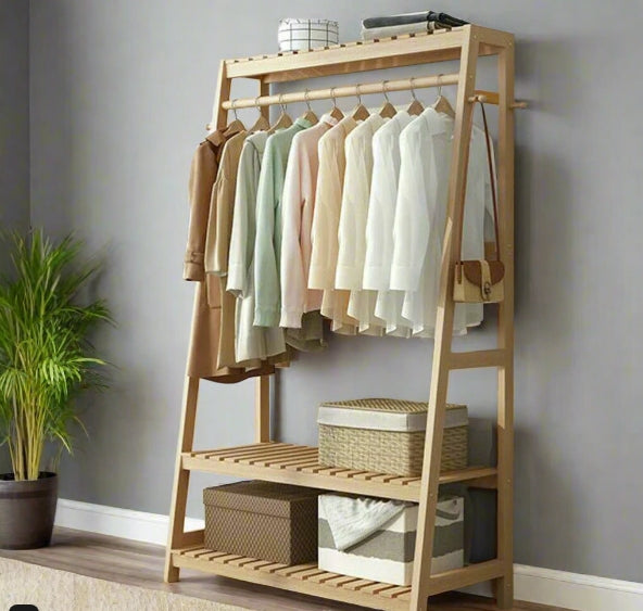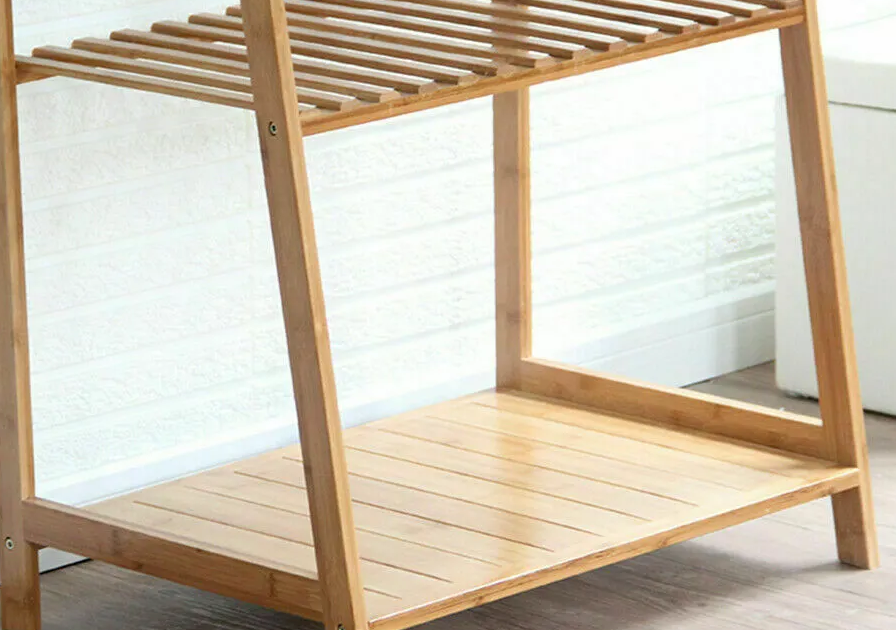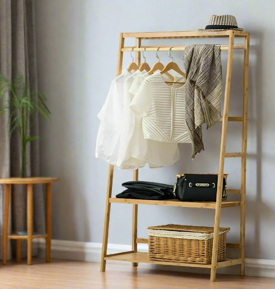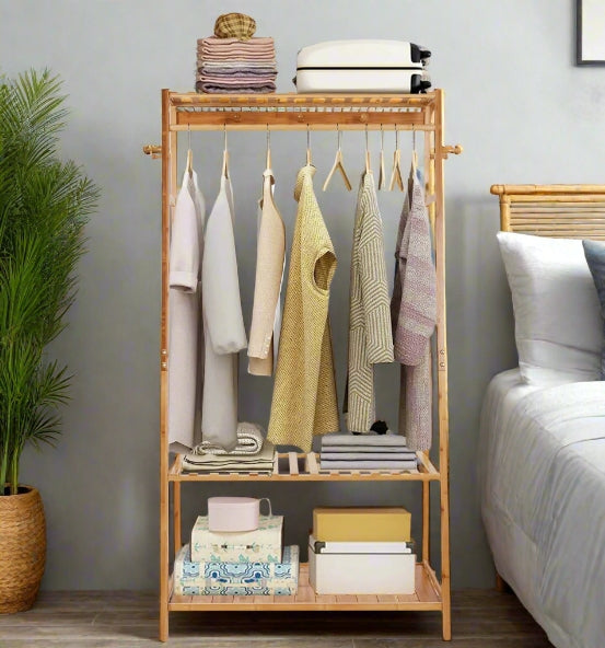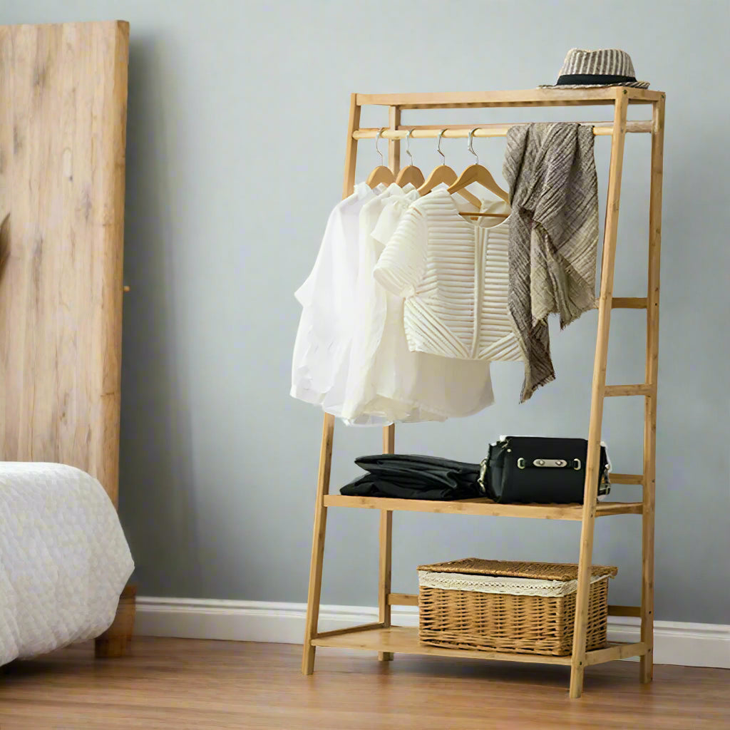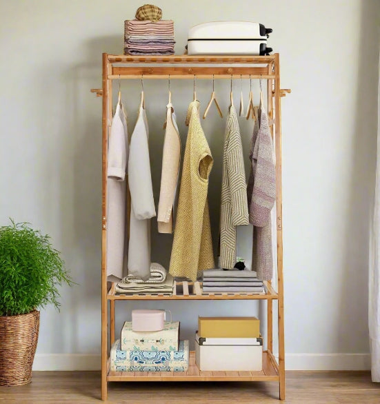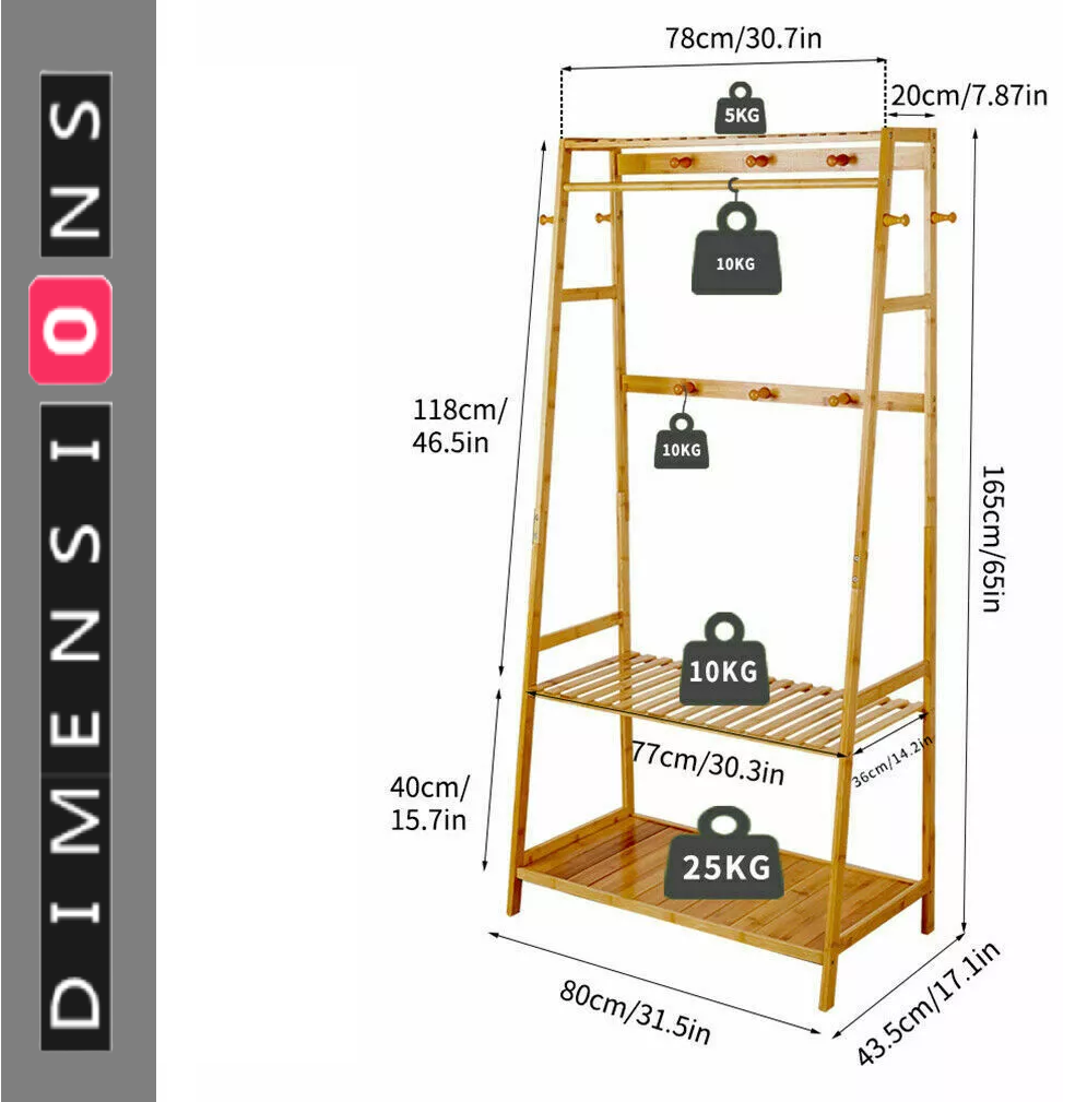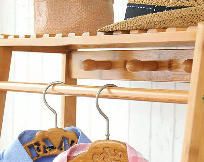 Organize your wardrobe with this sturdy bamboo clothes rail rack featuring a top shelf, three storage tiers, and 10 hooks for maximum functionality. Made from natural bamboo with carbonation treatment, it’s waterproof, durable, and built to last. Ideal for hanging clothes, storing shoes, and keeping accessories like bags, scarves, and umbrellas neatly arranged. Its slim design fits perfectly in narrow spaces and is easy to move between rooms. Assembly is simple with clear instructions and all necessary tools included.
