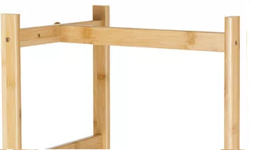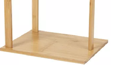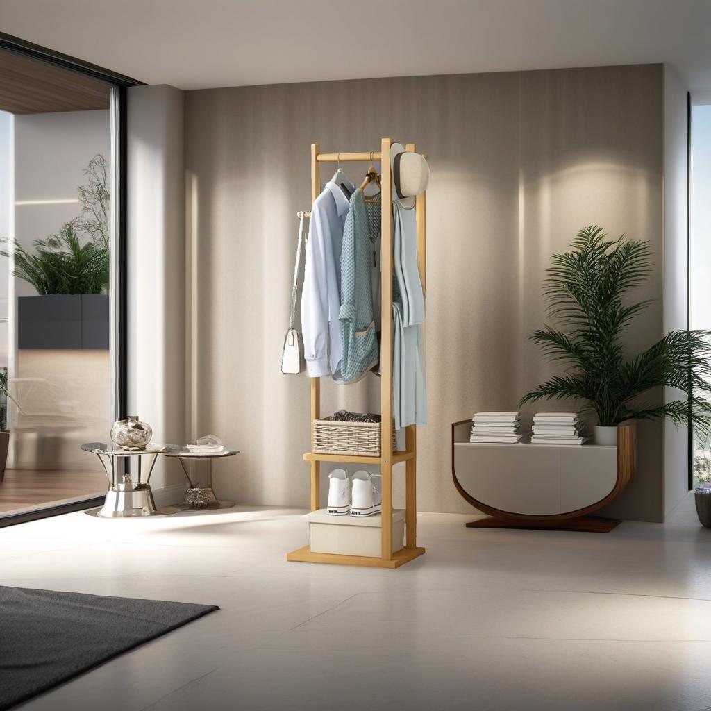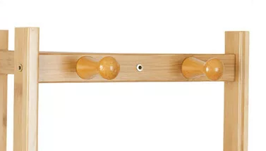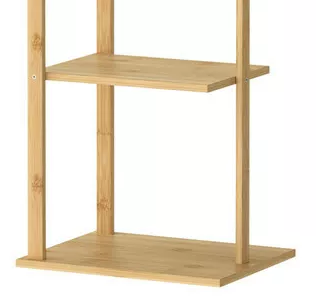 This freestanding bamboo storage unit is designed for both functionality and style. It features three hooks for hanging items, two shelves, and a hanger rod, providing versatile storage options. The product is a compact yet spacious solution for organizing clothes, accessories, or other items. Its natural wood finish enhances any room decor, and the lightweight design allows easy movement. Assembly is simple, and the unit comes packaged compactly.