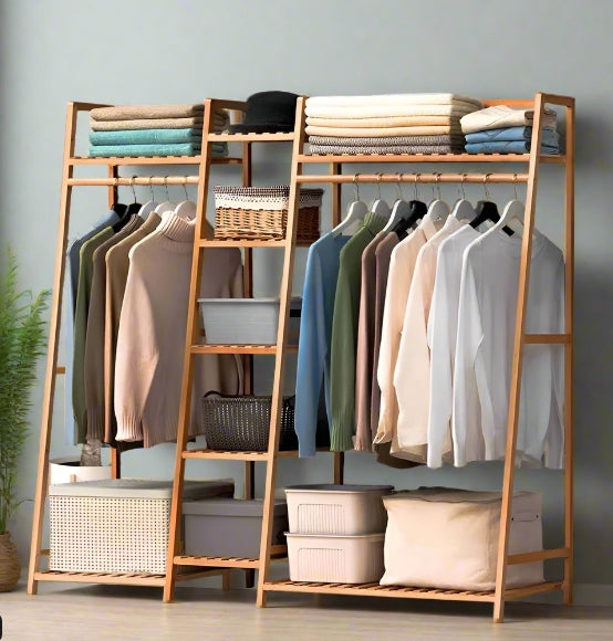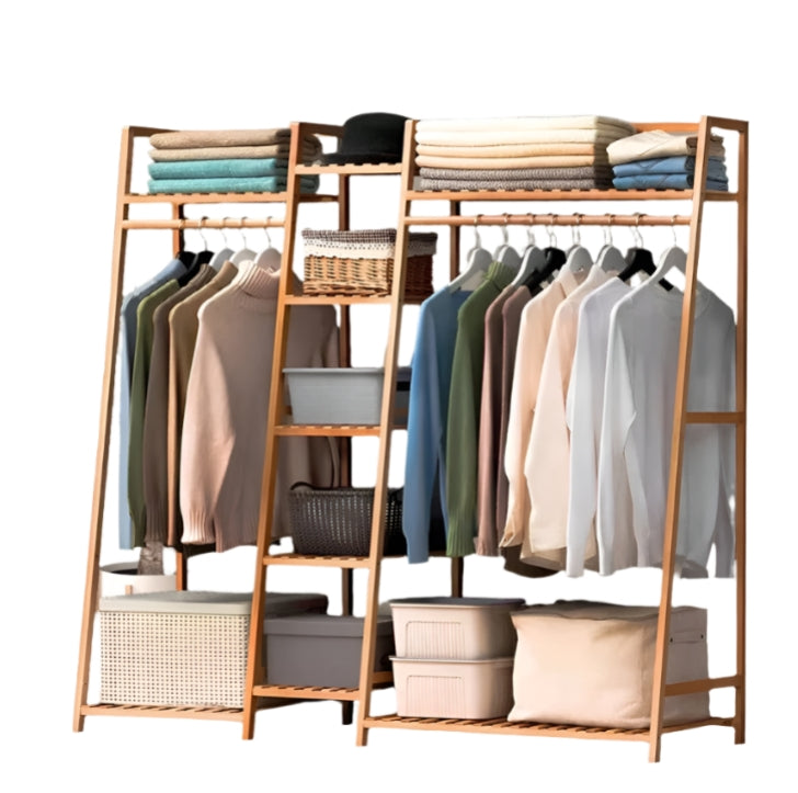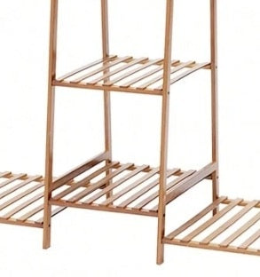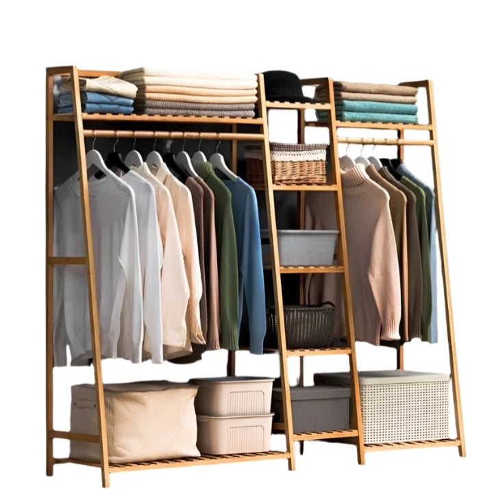 Organize your wardrobe in style with this elegant bamboo garment rack featuring a spacious ladder-style design. Crafted from high-quality natural bamboo, this coat rack offers exceptional durability and stability. It includes two sturdy hanging rods and five versatile shelves, plus two additional racks at the bottom—perfect for storing dresses, trousers, bags, shoes, and accessories in one convenient space.