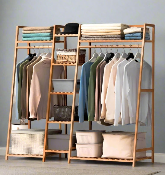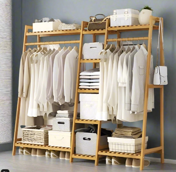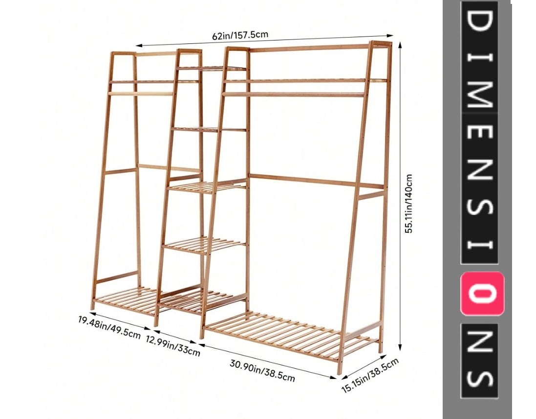The open design ensures easy access and visibility, while its natural finish complements a wide range of interior décor styles, from modern to rustic. Ideal for large bedrooms or dressing rooms, this multifunctional rack helps you keep your clothes and accessories neatly organized without sacrificing style.