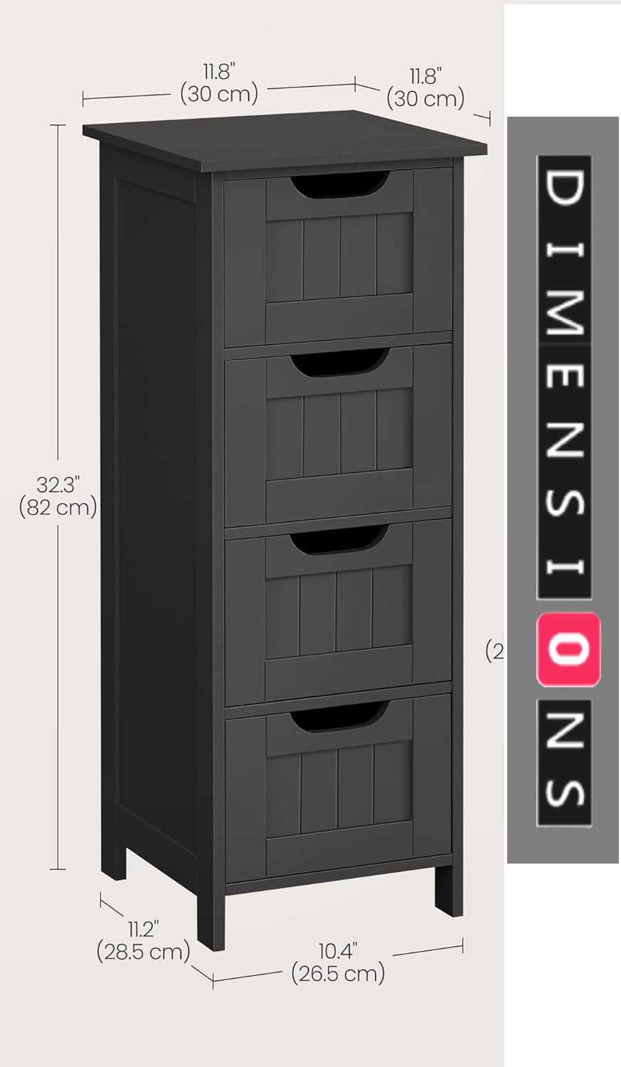 Bring modern style and functional storage to any room with this sleek ink black bathroom floor cabinet. Measuring 30 x 30 x 82 cm, this compact yet spacious unit features four drawers that provide ample room to store toiletries, toilet paper, perfumes, and other essentials while occupying minimal floor space. Made from durable MDF, this freestanding storage unit is built for long-lasting use and includes an anti-tip safety kit for added stability and peace of mind.