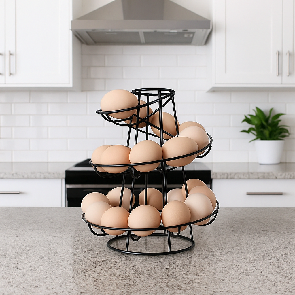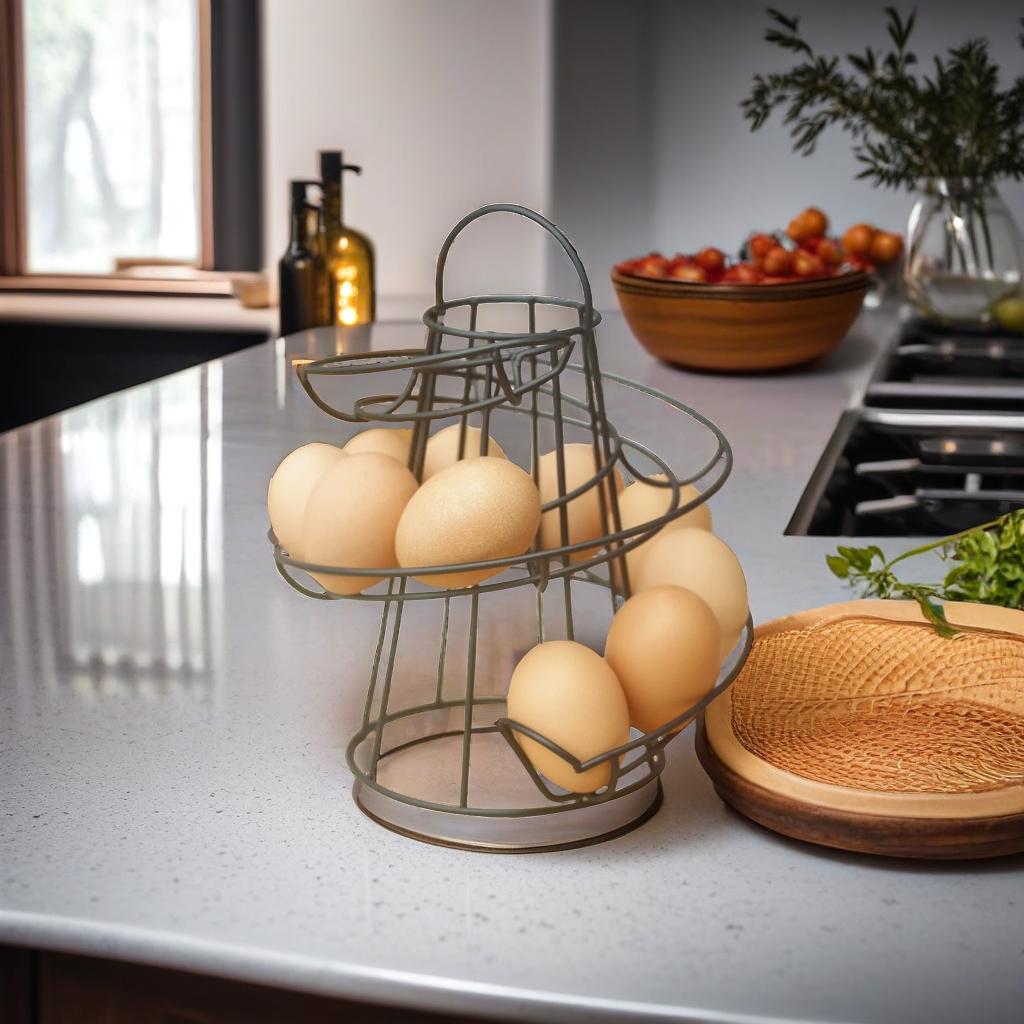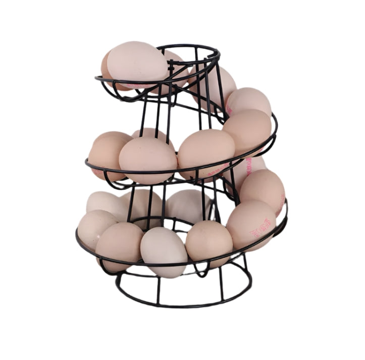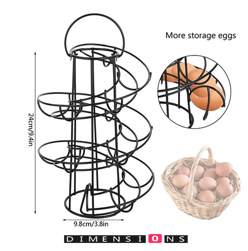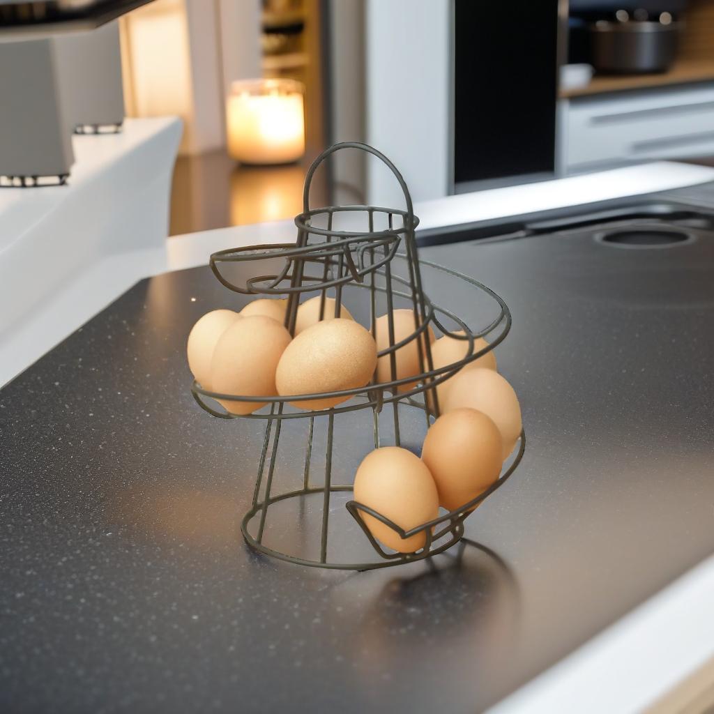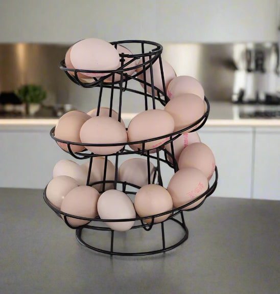 Keep your kitchen stylish and organized with this black spiral egg rack. Designed in a helter skelter shape, it offers a fun and functional way to store and display up to 18 eggs. Simply load eggs at the top to ensure first-in first-out rotation for maximum freshness. Crafted from durable iron with a sleek black finish, it makes an eye-catching addition to any kitchen counter.