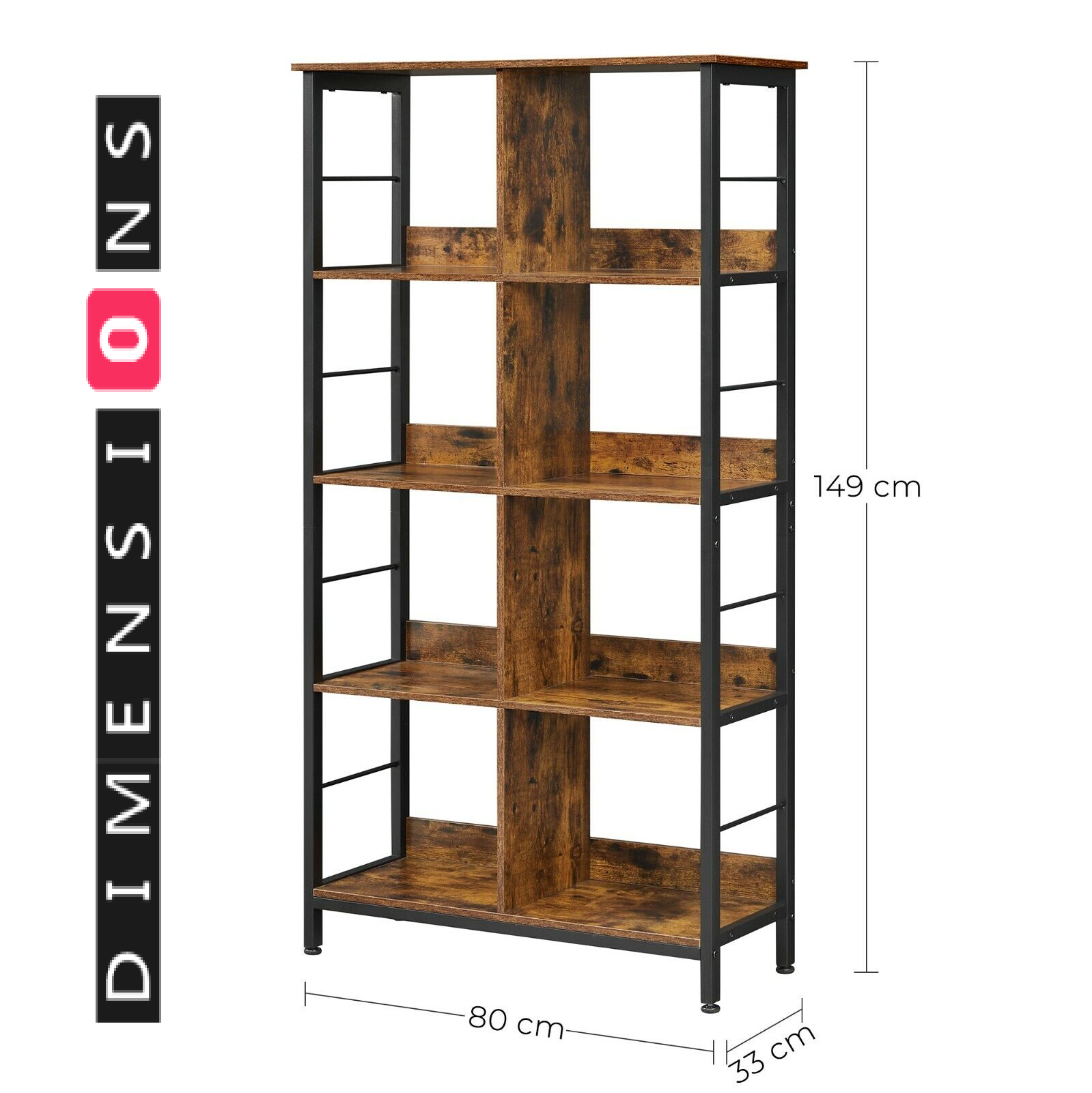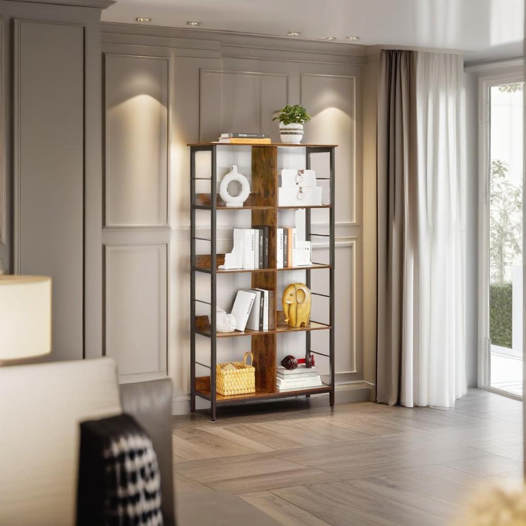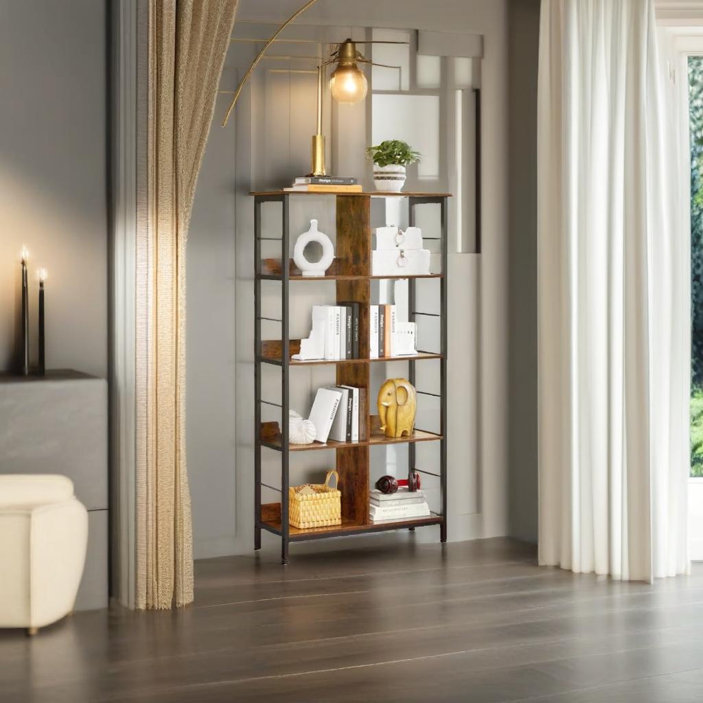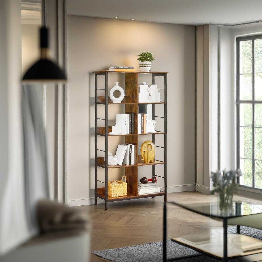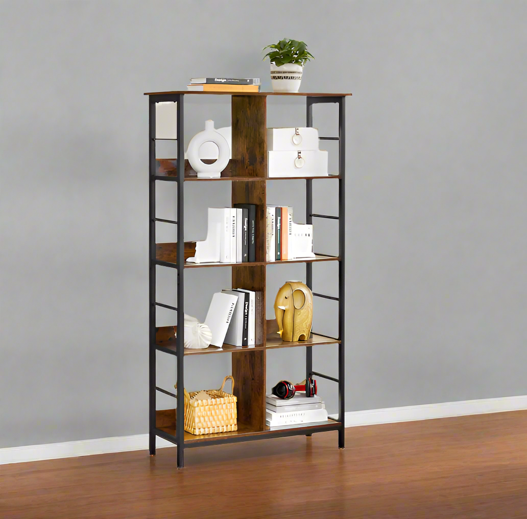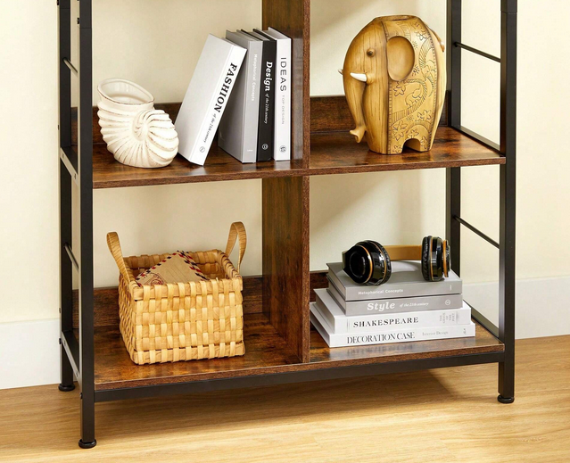 Add timeless charm and functional storage to your space with this 4-tier industrial-style bookshelf. Designed with 8 open compartments and a blend of rustic brown wood and black steel, this ladder shelf offers both visual appeal and durability. The sturdy steel frame and back panels ensure stability, while adjustable feet keep it level on uneven floors. Whether for novels, décor, or collectibles, this bookcase holds it all with ease.