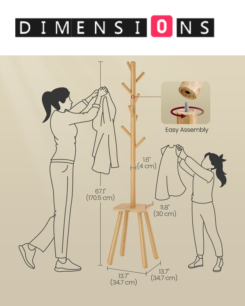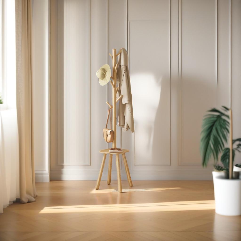 Bring function and style to your hallway or entryway with this freestanding coat rack made from durable rubberwood and MDF. With its clean lines and compact footprint, it offers both storage and a classic natural finish to suit any room. Equipped with multiple hooks and a built-in shelf, this stand is perfect for storing coats, hats, bags, and small essentials.