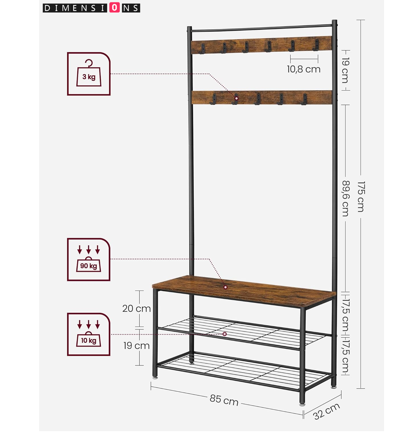 Built with a sturdy steel frame and stabilized by four adjustable feet, this coat stand provides reliable support for your belongings. An anti-tip kit is included to enhance overall stability. The bench, capable of supporting up to 90 kg, offers a comfortable spot to sit while putting on or taking off shoes. It also doubles as a storage shelf for organizing shoe boxes, storage bins, or even displaying decorative items.