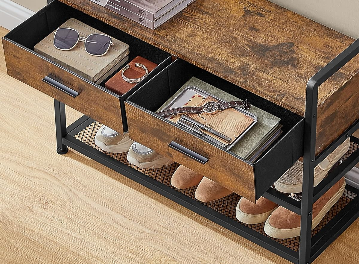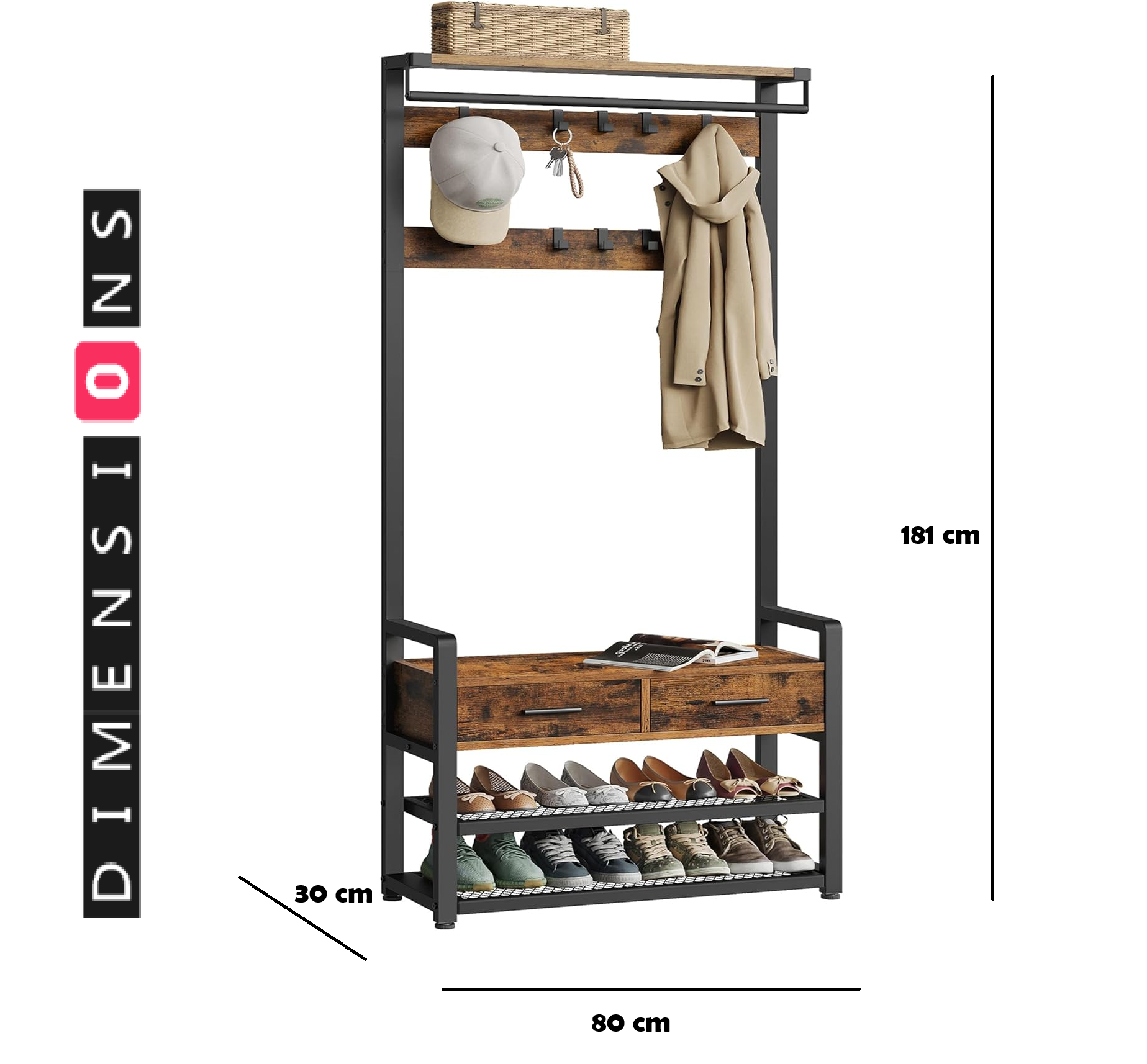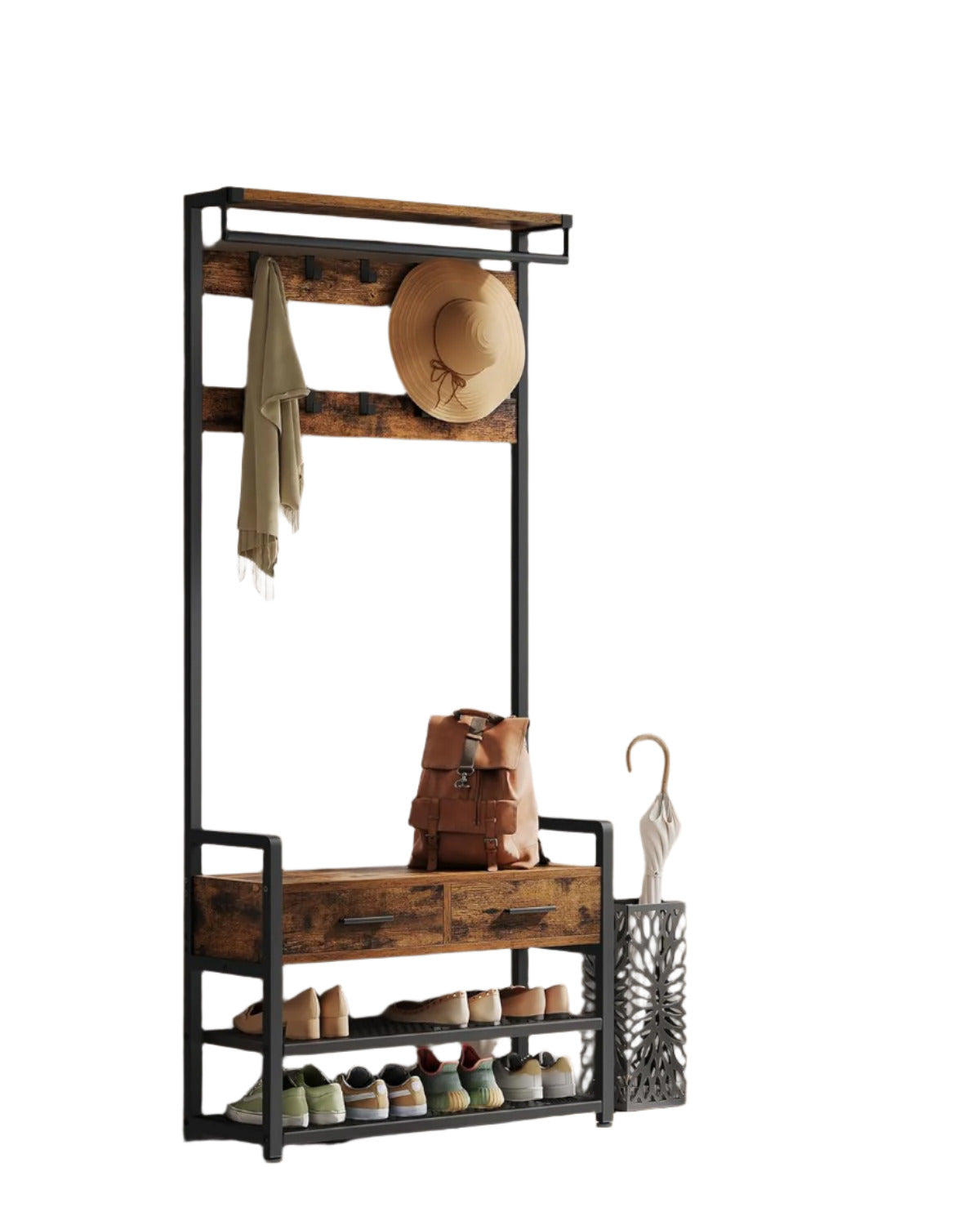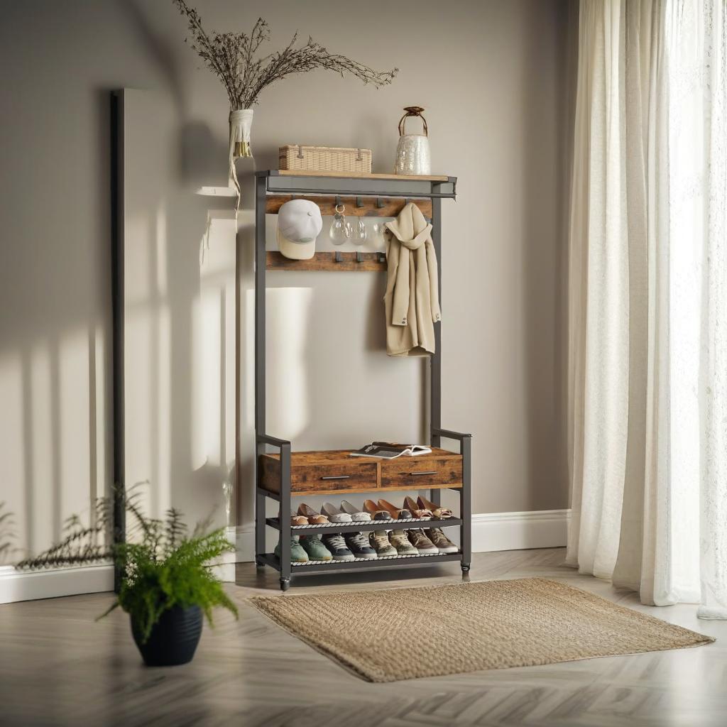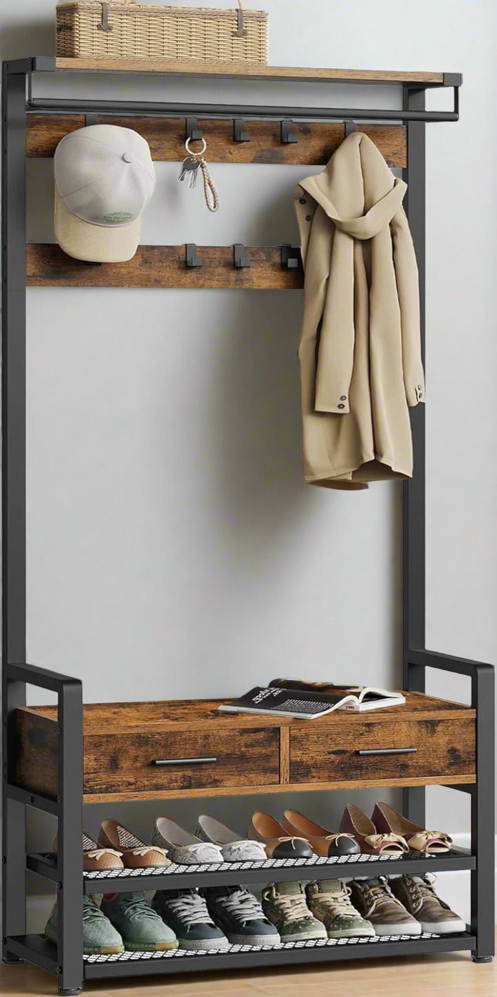 Optimise your hallway or entryway with this all-in-one hall tree that combines smart storage with rustic-industrial style. It includes 10 coat hooks, a clothing rail, a comfortable bench, two drawers, a two-tier shoe rack, and upper storage shelves — offering generous storage in a compact footprint.