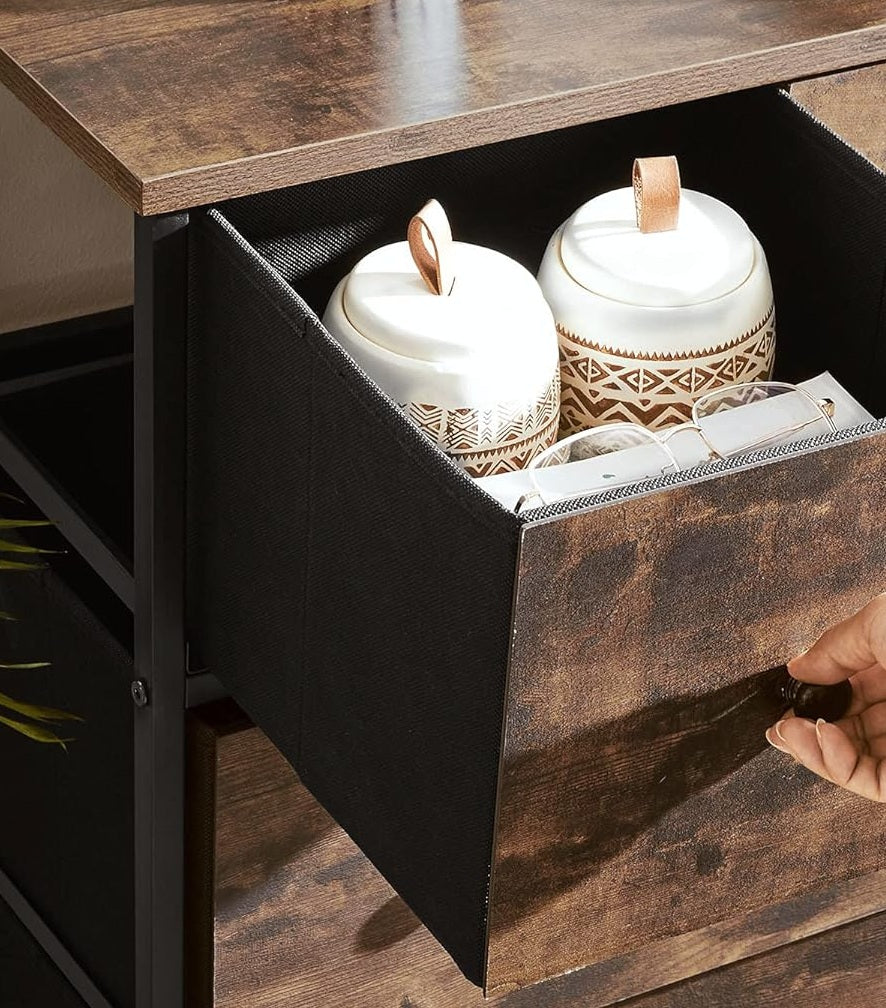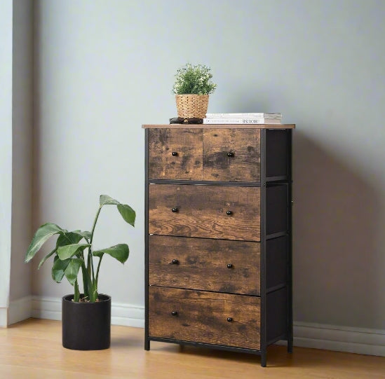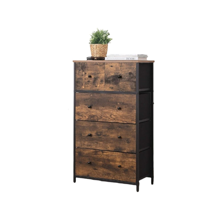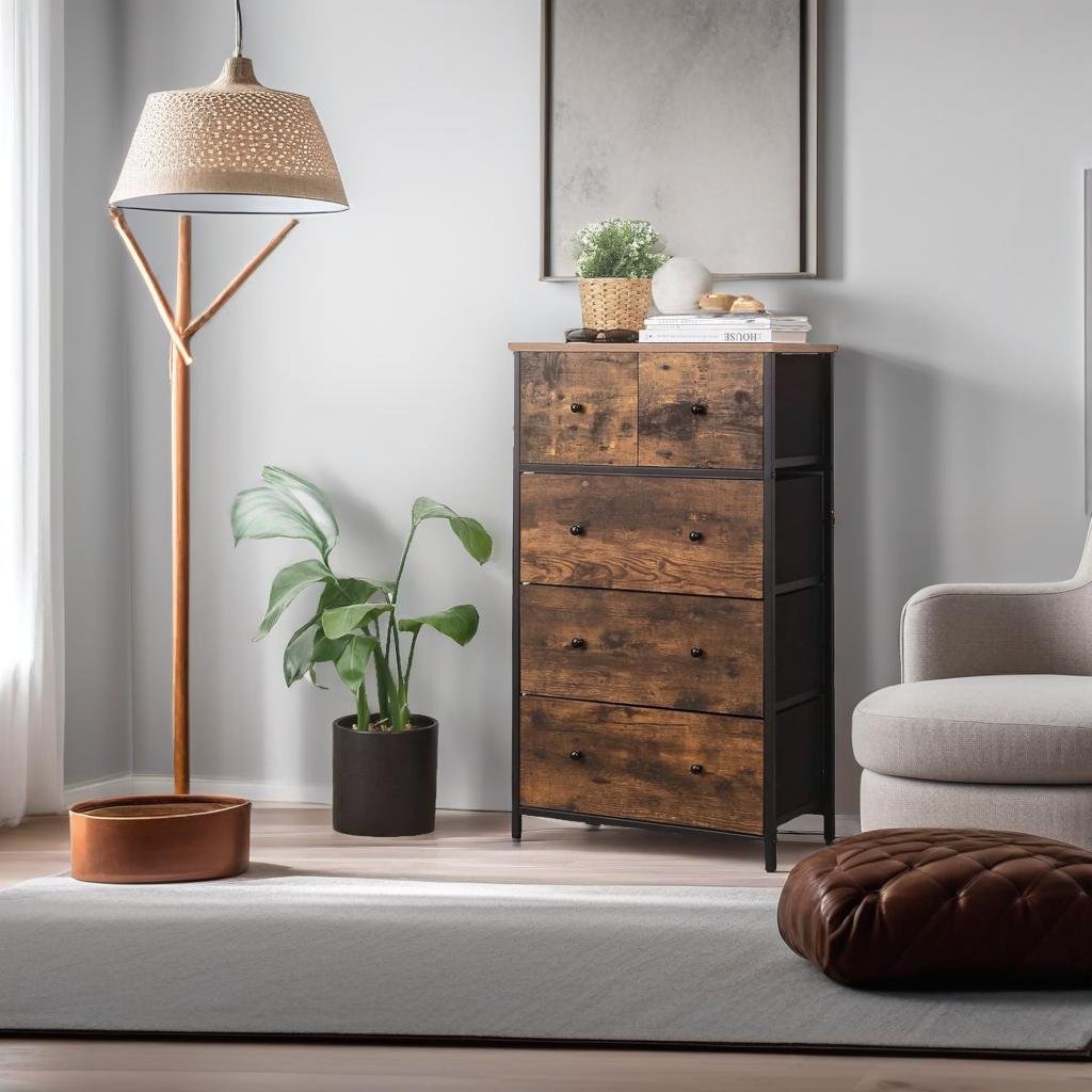 Featuring a blend of rustic brown and black colors and complemented by solid wood handles, this chest of drawers adds a touch of elegance to your home decor.