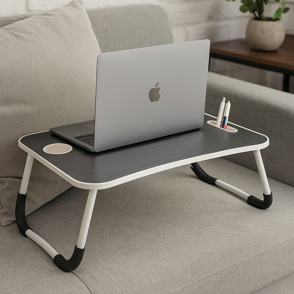Upgrade your comfort while working, reading, or dining with this multifunctional folding laptop bed table. Designed with convenience in mind, it features a spacious MDF desktop with a built-in cup holder and device slot—perfect for holding phones, tablets, or books.