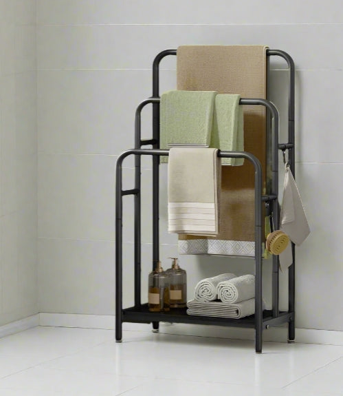 Keep your bathroom tidy and stylish with the Freestanding Towel Rack. Featuring a 3-tier design with multiple hanging bars, this towel holder maximizes drying space for your bath towels, blankets, and more. Its smart ventilation spacing allows towels to dry quickly, preventing odours. The added hooks and bottom shelf provide convenient storage for bath sponges and essentials, helping you maintain an organized space. Crafted from durable steel and particleboard, this rack is designed for stability and easy assembly, making it a perfect addition to any bathroom.