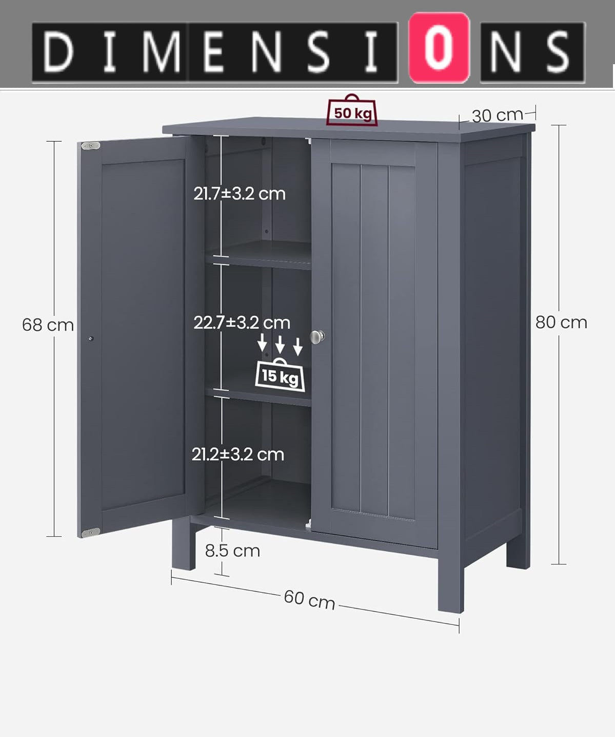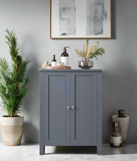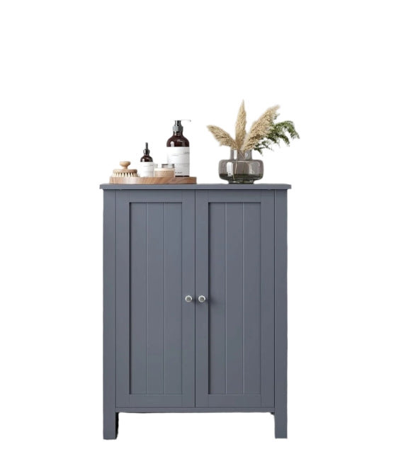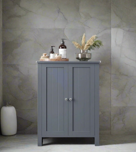 Maximise your bathroom space with this elegant grey freestanding storage cabinet, designed to offer generous storage in a compact 30 x 60 x 80 cm footprint. Perfect for bathrooms, hallways, or living spaces, this floor unit features double doors with beadboard-style panels and two adjustable shelves, each with three height options—ideal for storing everything from toiletries and cleaning supplies to towels and decor. Crafted from durable MDF and finished in a modern grey tone, this bathroom cupboard combines strength with style