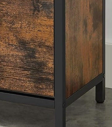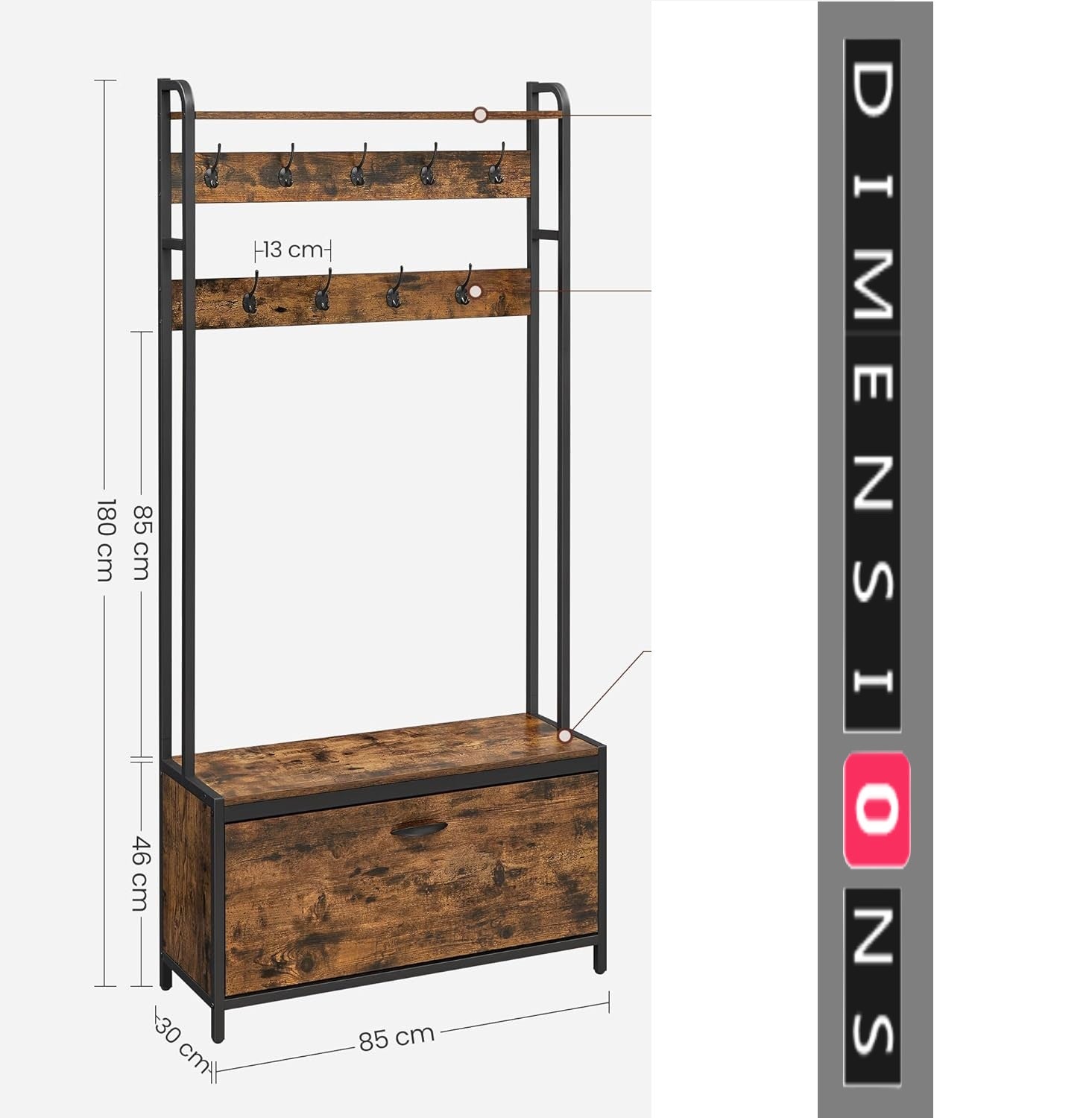 The 30 cm deep flip compartment includes a 3-position adjustable divider for various shoe sizes—perfect for heels, trainers, and slippers. Built from durable steel and rustic brown particleboard, and reinforced with V-bars, this coat rack offers reliable strength with a 100 kg bench load capacity. Style meets function in one organised space.