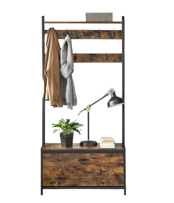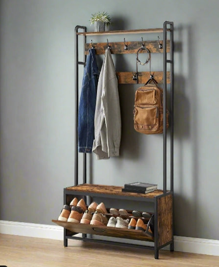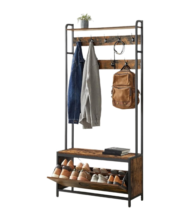 Maximise your entryway with this 4-in-1 industrial hall tree, featuring a coat rack with 9 hooks, a flip-door shoe cabinet, a sturdy 85 cm wide bench, and a top shelf for décor. Its multifunctional design lets you hang coats, store up to 8 pairs of shoes neatly behind a dustproof panel, and comfortably sit while putting them on.