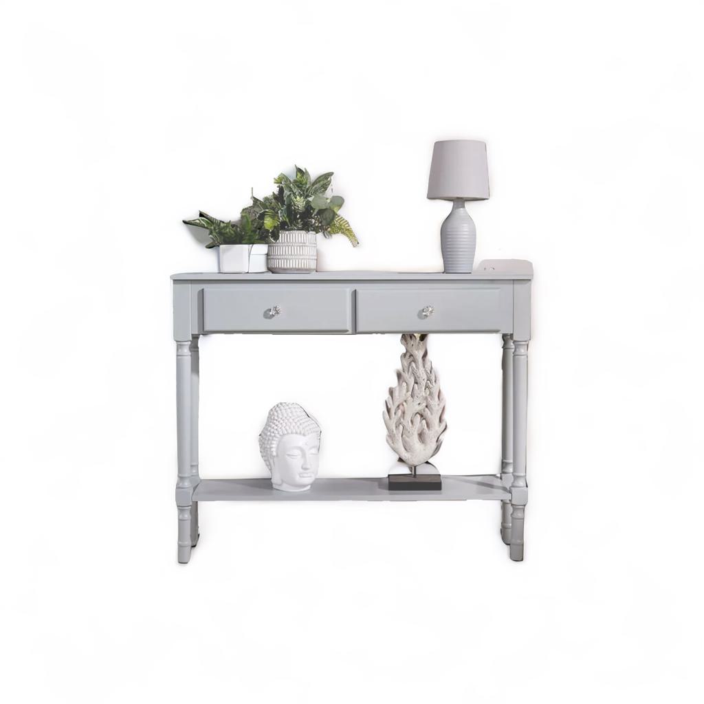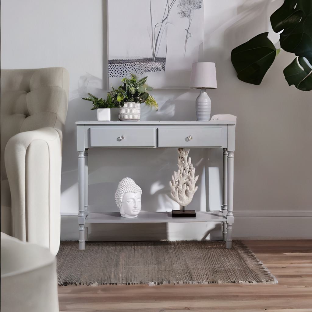 This 2-drawer console table is the perfect accent piece for any room in your home. Whether placed in the hallway, living room, or entryway, its sleek design and contemporary vibe effortlessly enhance your space. The two spacious storage drawers provide a practical solution for keeping your home organized and clutter-free. Crafted from high-quality MDF and pine wood, this table is both sturdy and secure, offering lasting durability. This versatile console table fits seamlessly into various spaces, combining both functionality and modern elegance.