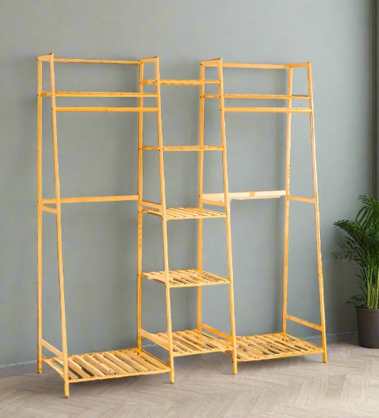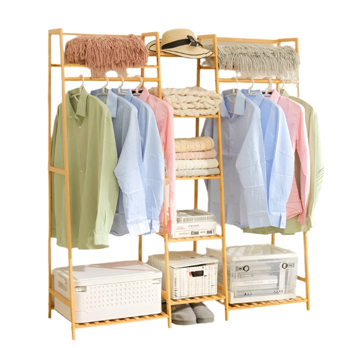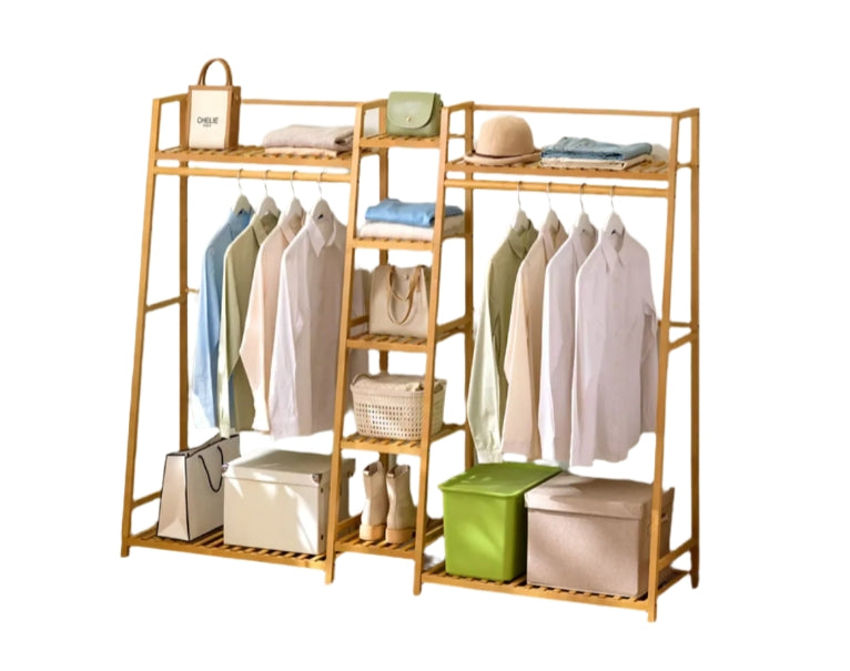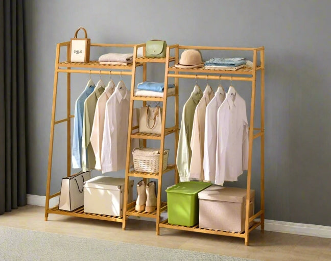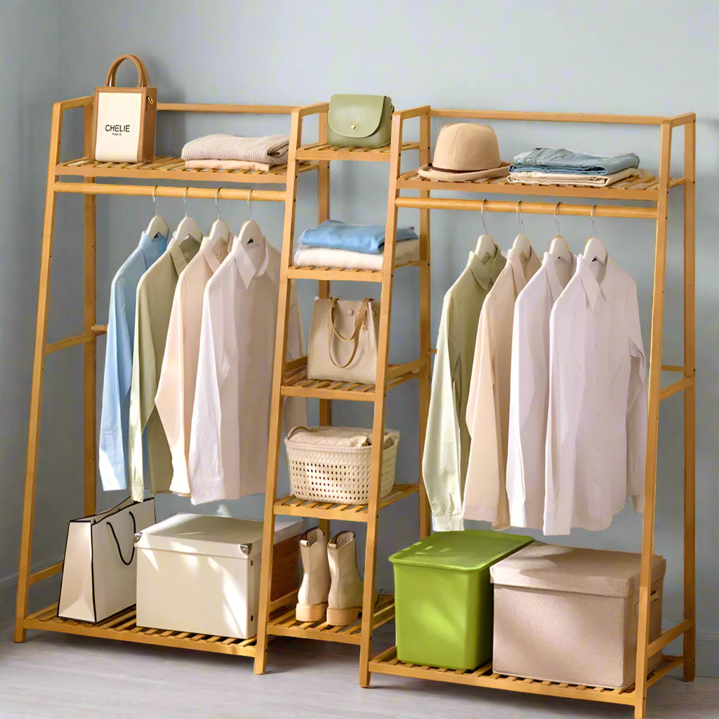 Upgrade your home storage with this heavy-duty bamboo clothes rail rack featuring a smart corner design for maximum space efficiency. Crafted from eco-friendly bamboo, this versatile garment rack combines style and function to keep your clothes, shoes, handbags, and daily essentials neatly organized and easily accessible.