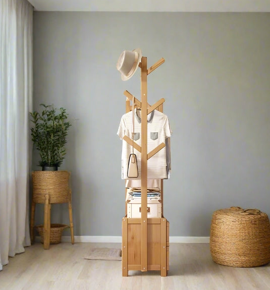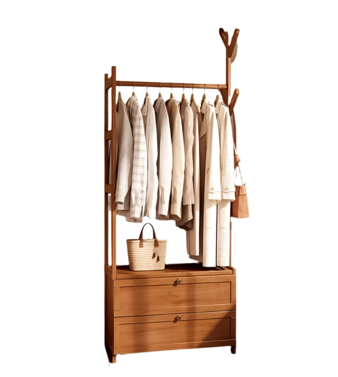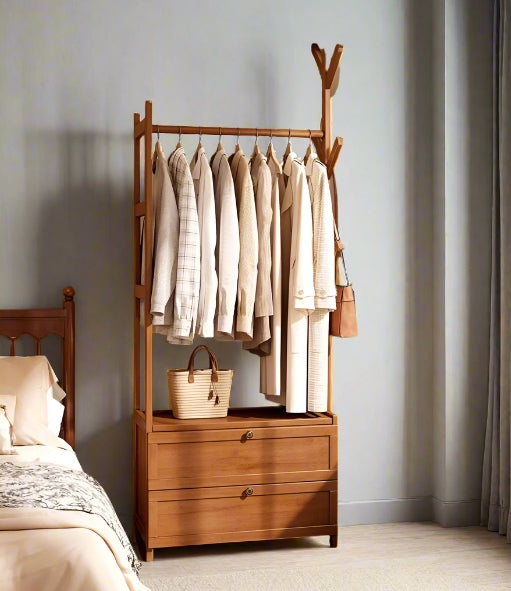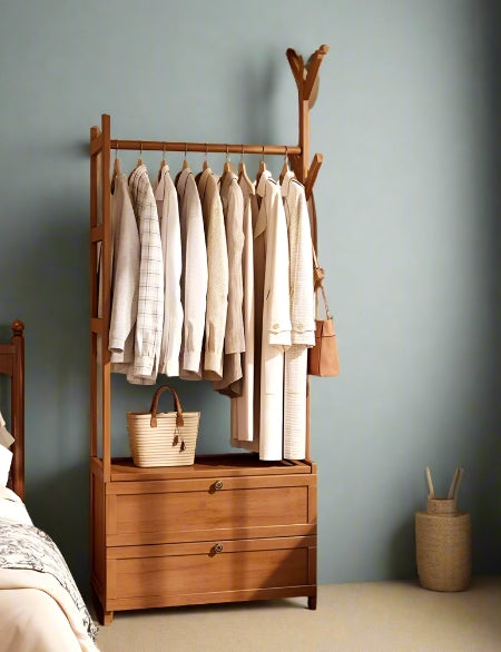 Organize your wardrobe with this heavy-duty bamboo clothes rail rack, designed to offer both style and storage. Featuring a natural bamboo finish, this open wardrobe includes a sturdy hanging rod, two integrated drawers, and top hat hooks—perfect for hanging clothes, trousers, bags, and accessories. The open design ensures easy access to your items, while the compact structure makes it ideal for bedrooms, dressing rooms, or entryways. Eco-friendly, durable, and elegant, it’s a practical solution for modern storage.