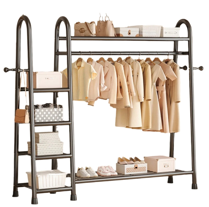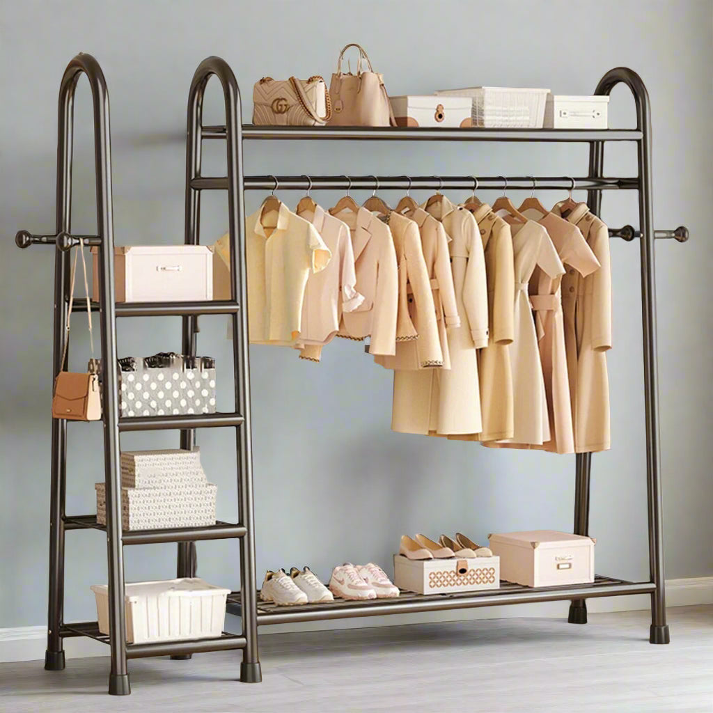 Heavy Duty Double Clothes Rail Rack with Bottom Storage Shelves & Hooks