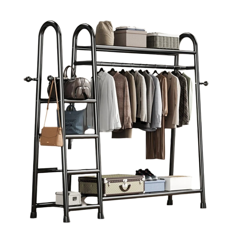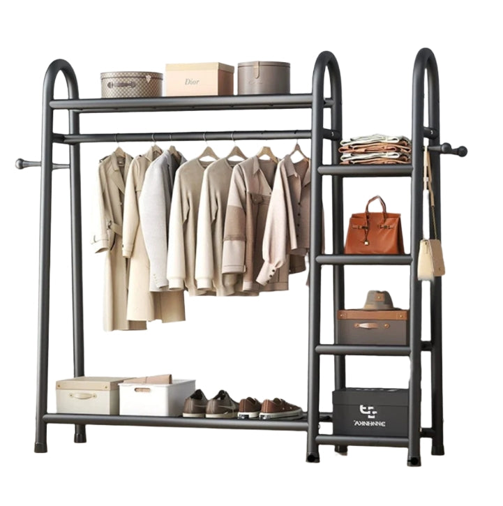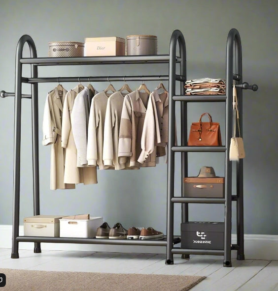 Organize your wardrobe efficiently with this heavy-duty double clothes rail rack, perfect for bedrooms, laundry rooms, dormitories, or outdoor drying. Crafted from premium metal with heavy gauge chromium plating, this garment rack resists rust and corrosion for long-lasting durability. Featuring two sturdy hanging rails for ample garment space and dual bottom shelves for shoes and accessories, it keeps everything neat and accessible. Four convenient hooks add extra storage for bags and hats. Easy to assemble and clean, this versatile rack doubles as a drying rack and shoe organizer, making it an essential addition to any home or office.