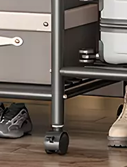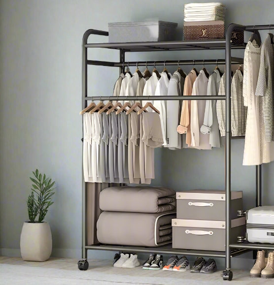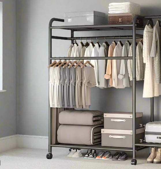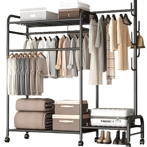 -Key Feature: Multi-layer double hanging rails with three storage shelves and 6-wheel mobility