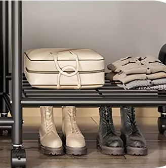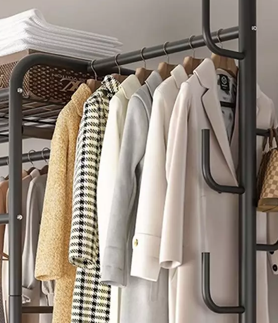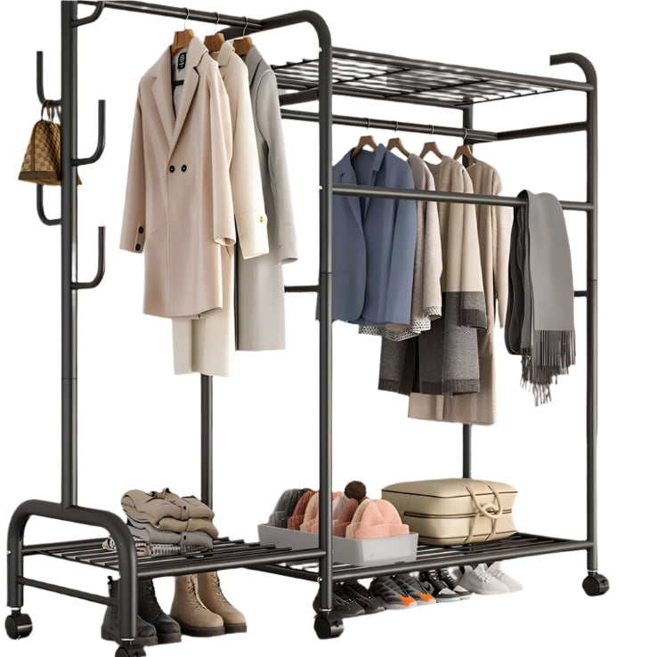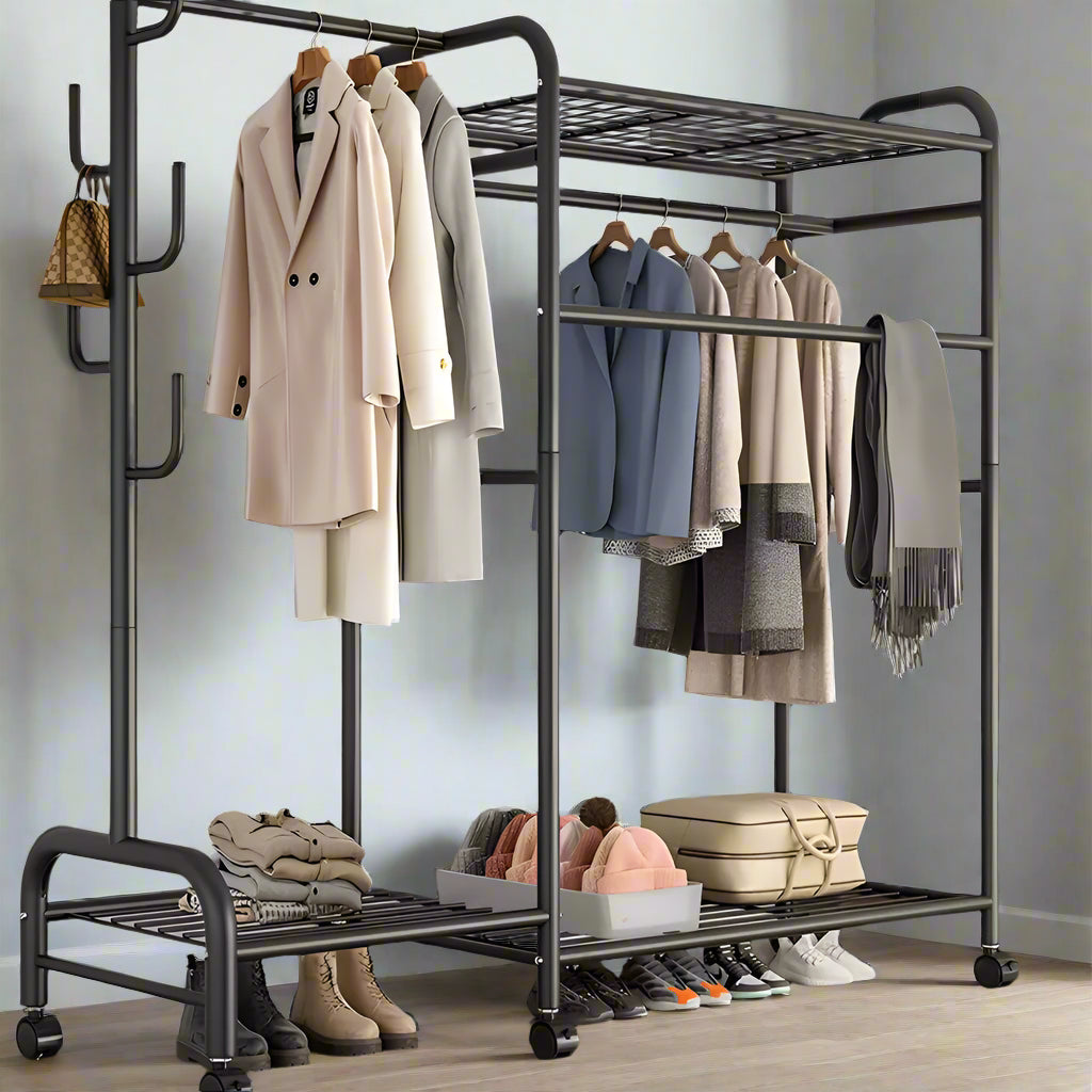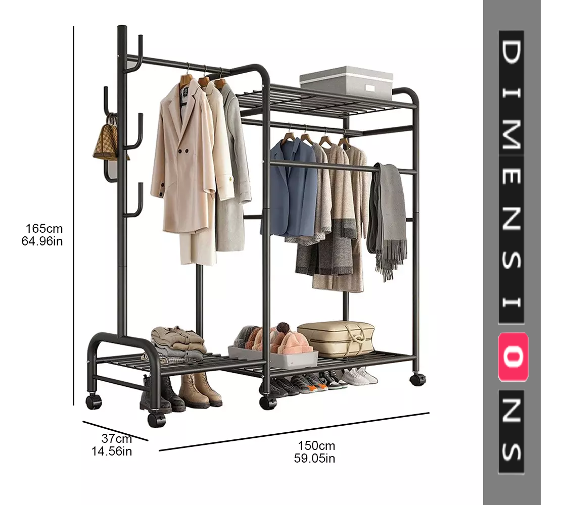 Keep your clothes and shoes organized with this heavy duty double clothes rail rack, designed for durability and versatility. Crafted from high-quality painted iron pipes with thickened bases and rails, this rack offers excellent stability and long-lasting strength. Featuring double-layer hanging areas, a long skirt section, and three layers of storage racks, it’s perfect for bedrooms, balconies, or laundry rooms. The built-in large iron hooks and 6 smooth-rolling wheels provide easy mobility and additional storage options. Whether drying clothes on the balcony or tidying up your room, this rack is a stylish and practical storage solution suited for any home décor.