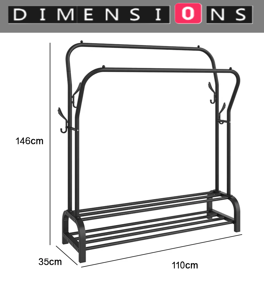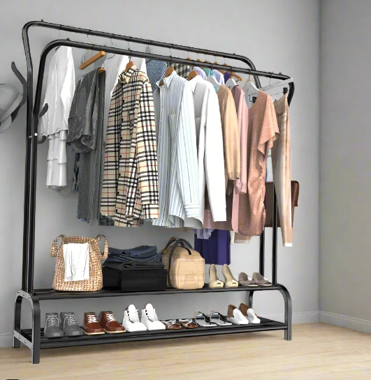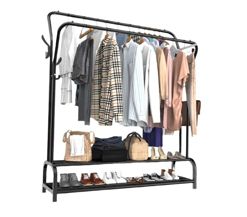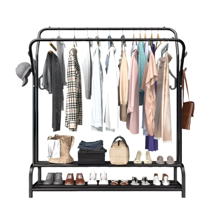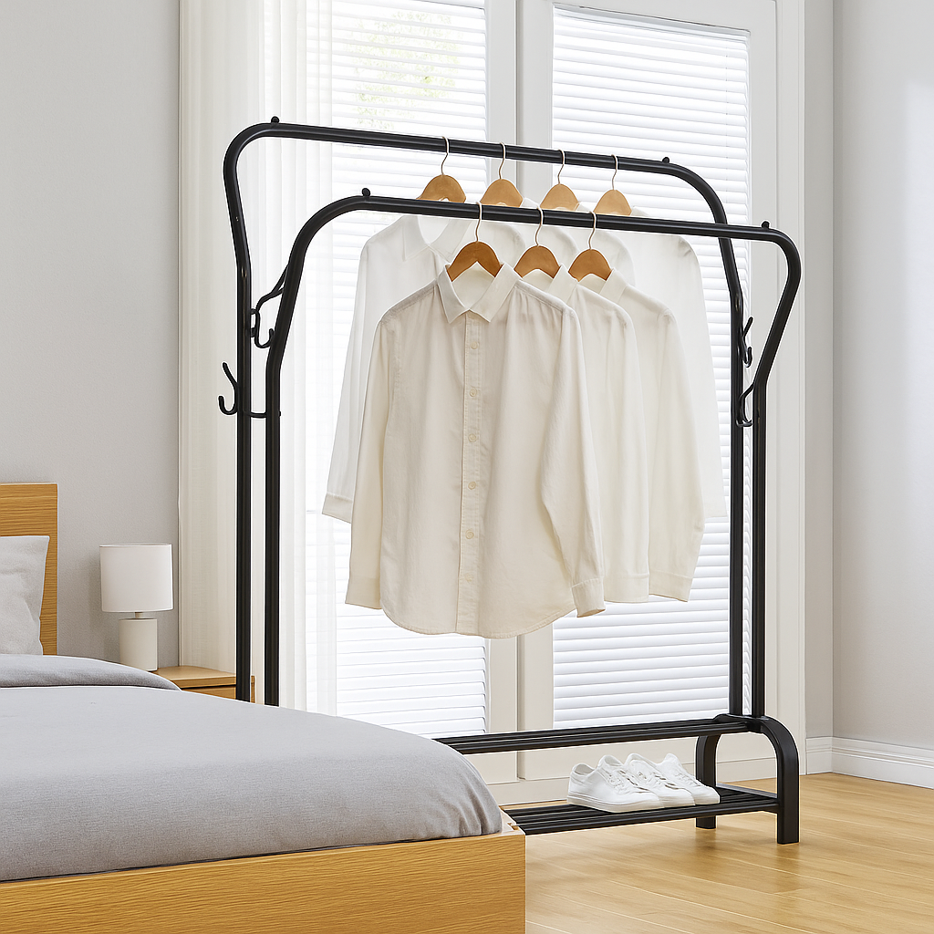 Organize your wardrobe in style with this Heavy Duty Double Rail Clothes Rack, designed for homes, bedrooms, and retail displays. Made from rust-proof thick steel tubing, this modern freestanding garment stand offers long-lasting strength and impressive load capacity up to 50kg – ideal for hanging coats, suits, and dresses without bending or wobbling.