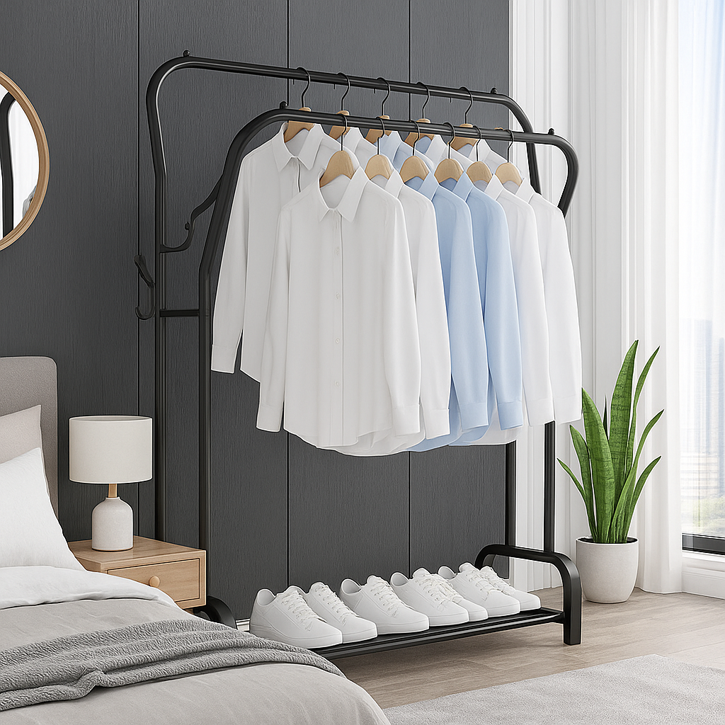 With a clean, minimalist design, it blends seamlessly into any décor and is easy to assemble or disassemble as needed. The removable bottom shelf is perfect for storing shoes, bags, or folded items, helping you keep your space neat and functional. Whether for a bedroom, dressing room, or boutique showroom, this garment rail brings both utility and modern appeal.