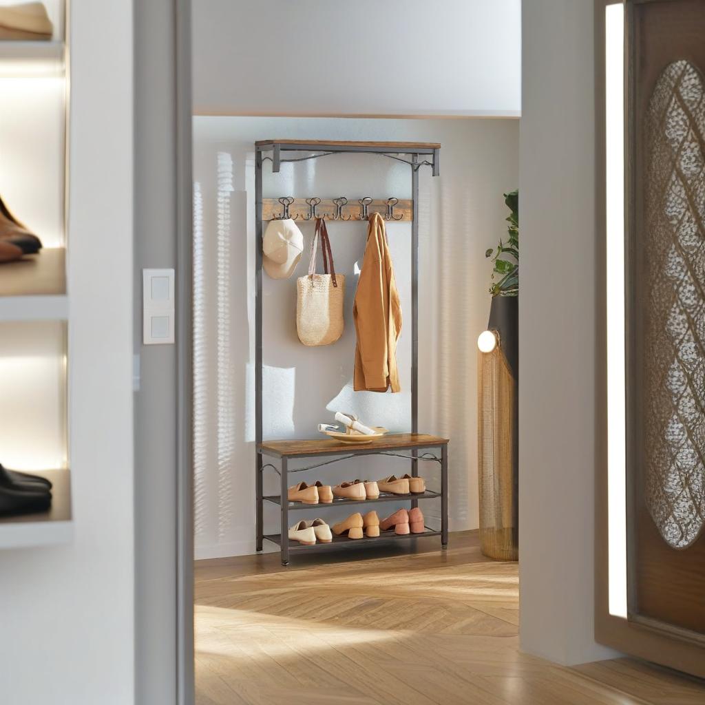 Welcome home with this stylish coat rack that not only adds a rustic and elegant touch to your entryway but also keeps it organized. Designed to greet you and your guests with ease, it features 5 double hooks for coats, hats, and scarves, and a convenient bench for removing or putting on shoes. The metal storage shelves below offer additional space for organizing shoes and accessories.