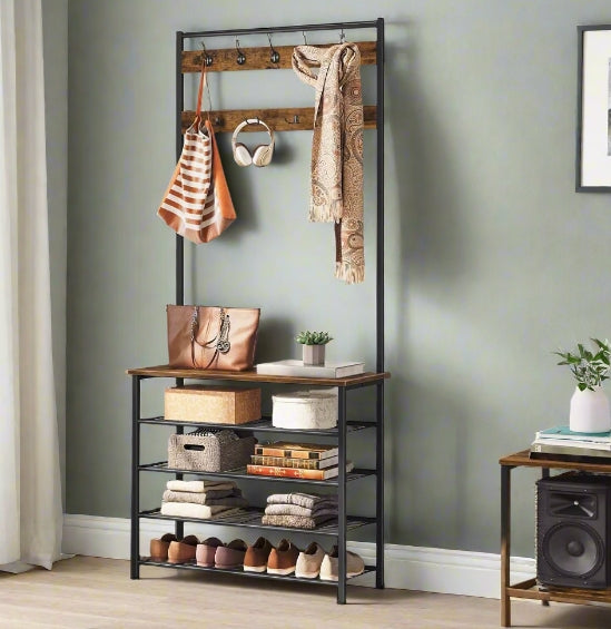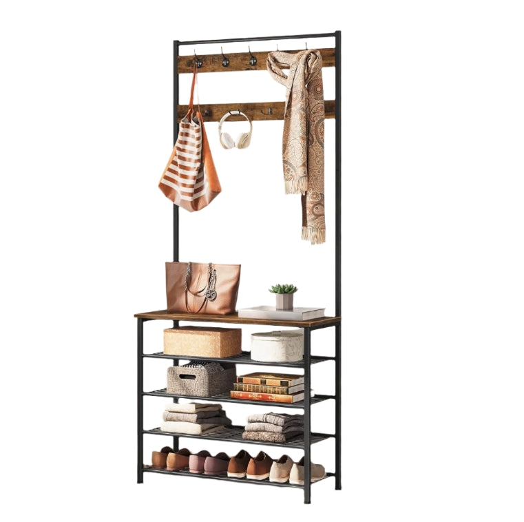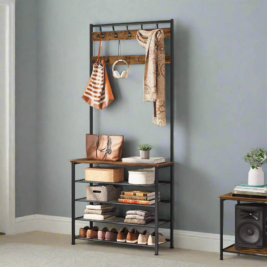 Industrial Coat Stand with Shoe Storage - Hall Tree with 9 Hooks