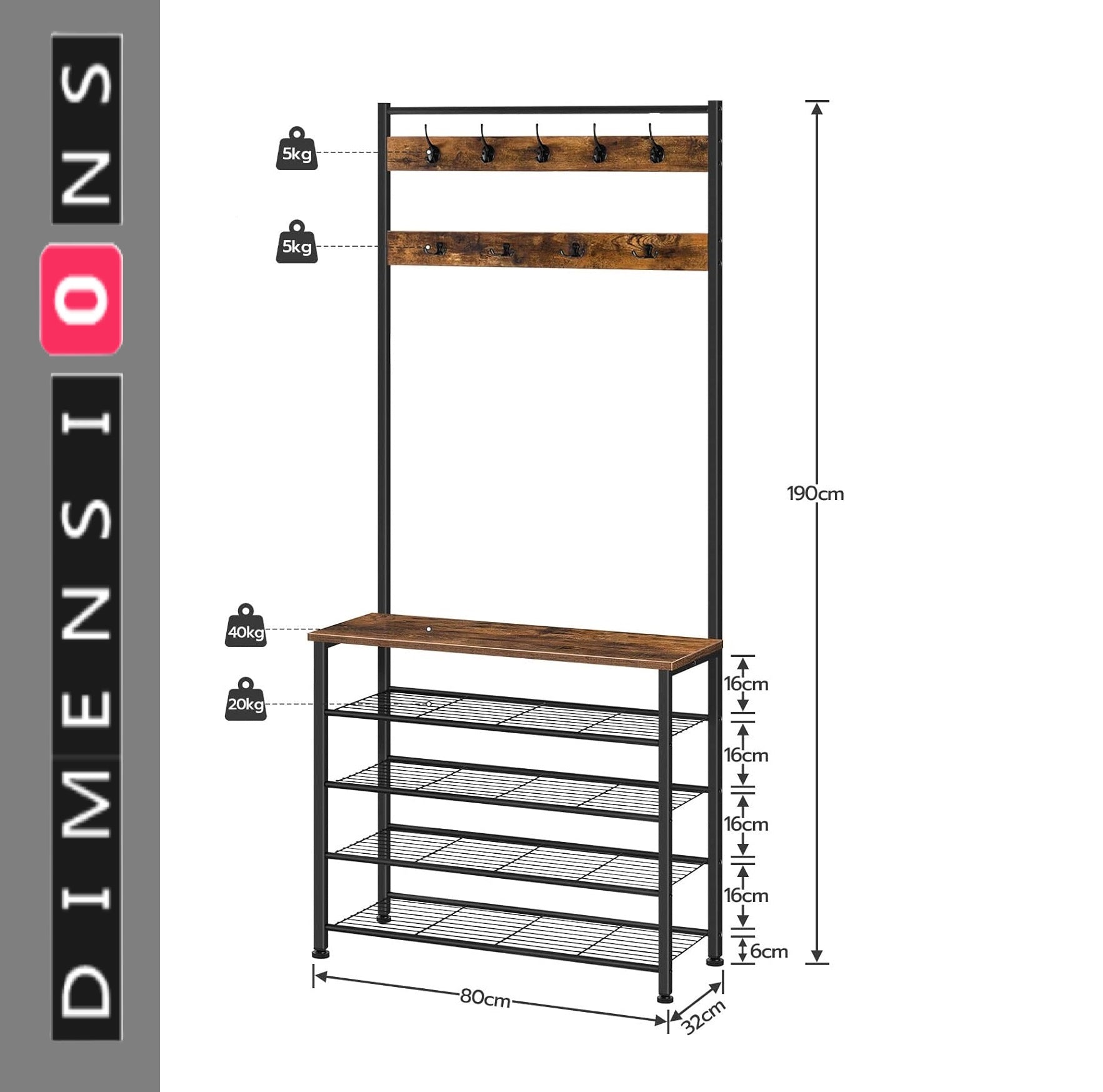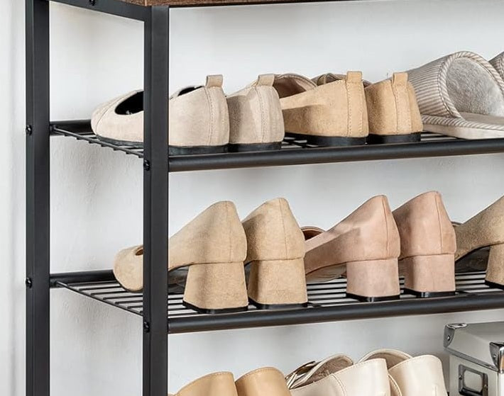 Transform your entryway into an organized and stylish space with this unique coat stand. Designed for practicality and elegance, this item is perfect for organising coats, scarves, shoes, bags, and hats in your lobby. Its sleek and thoughtful design is ideal for tight spaces, helping you keep your home clean and tidy. This hall tree offers a multifunctional solution for your storage needs. Hang jackets, coats, and bags on the sturdy hooks, while storing shoes and bags on the five spacious shelves below. Each mesh shelf can support up to 20 kg, providing ample storage for all your essentials. Say goodbye to clutter and hello to a well-organised entryway. The coat stand features two rows of staggered hooks in different styles, allowing you to easily hang stray hats and frequently worn coats on its nine solid hooks. Each hook is designed to support up to 5 kg, offering both functionality and durability.