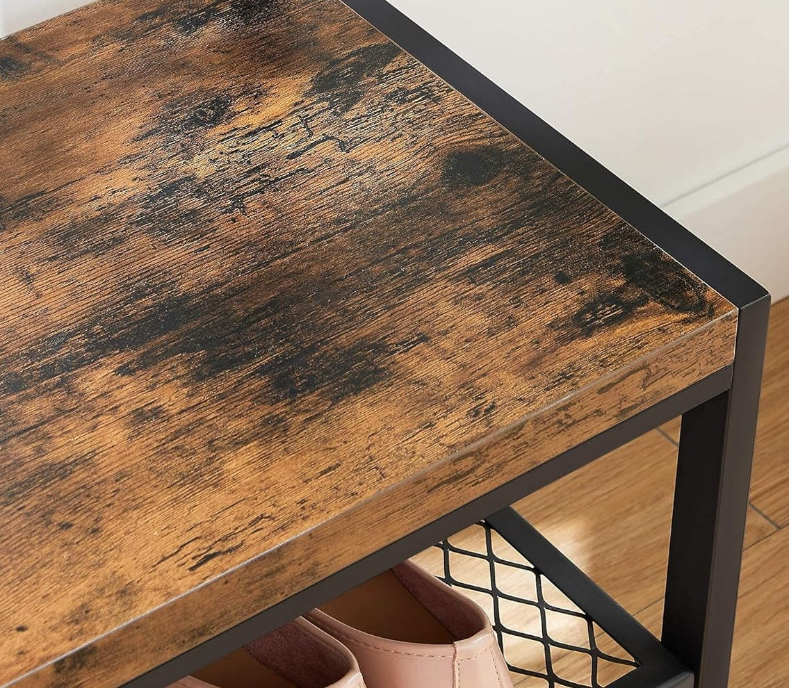 This industrial-style coat rack combines rustic brown chipboard panels with a black metal frame, adding a stylish touch to your home. Featuring 12 hooks in two rows, two lattice shelves for shoes, and a sturdy bench, it provides a highly functional solution for your entryway, office, or bedroom.