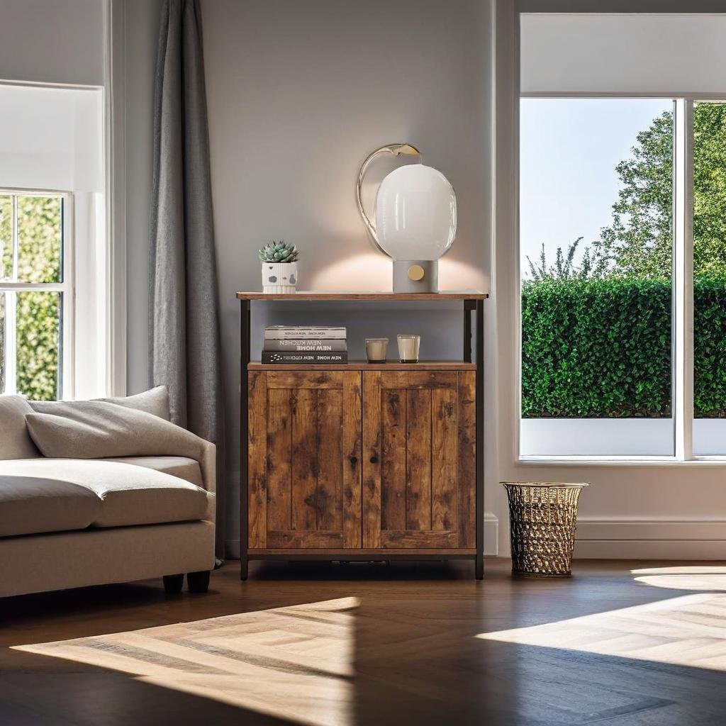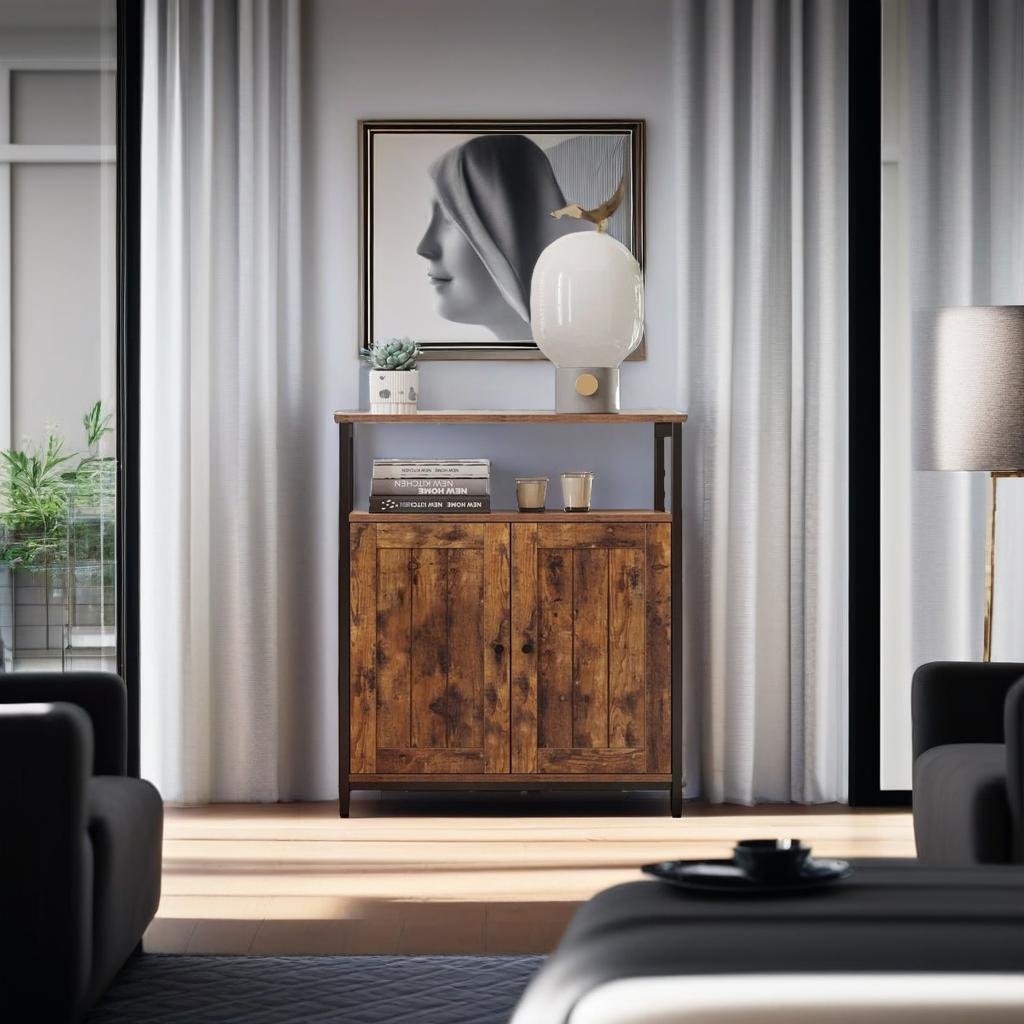 Add a dash of glamour to your living room, hallway, or bedroom with this industrial-style storage cabinet featuring a sturdy black steel frame and rustic brown particleboard. The open shelf and slat door provide a perfect balance between display and hidden storage for your vases, photos, magazines, and daily essentials. Built for stability and durability, this cabinet features adjustable feet and strong materials designed to last. Easy to assemble with numbered parts and clear instructions, it’s a practical and stylish addition to any home.