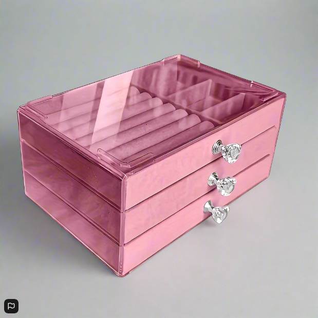 Keep your jewelry collection neat and stylish with this large pink acrylic 3-drawer storage box. Designed for practicality and elegance, it features three spacious tiers with removable drawers to customize compartments for rings, earrings, bracelets, and necklaces.